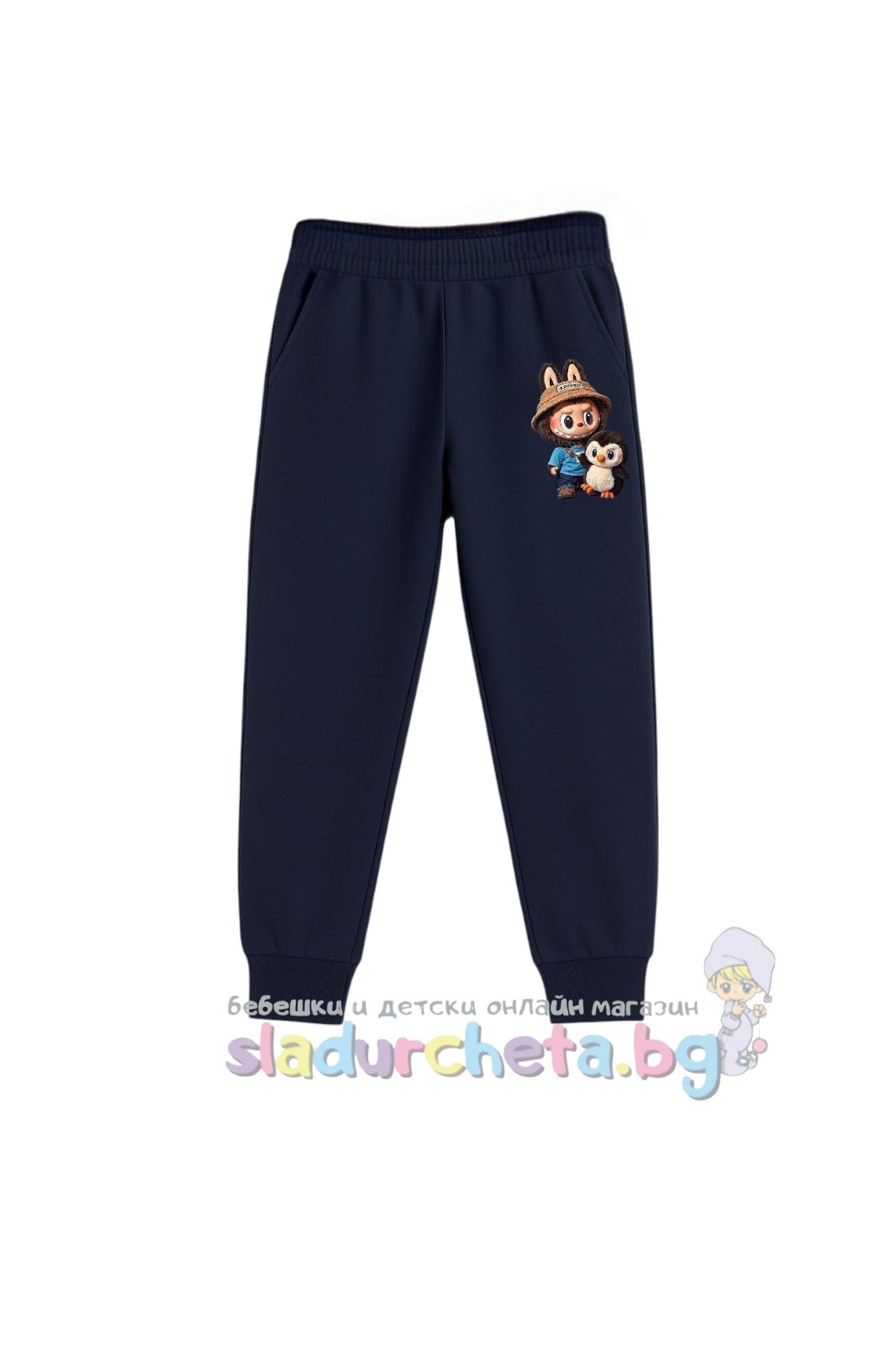 Панталонът е с два джоба с ципове в тъмносин цвят с апликация на Лабубу и ластична част на талията;