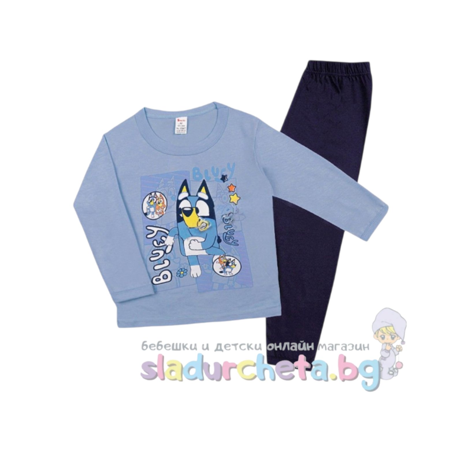 Блузата е с дълъг ръкав в син цвят с апликация на Блуи;