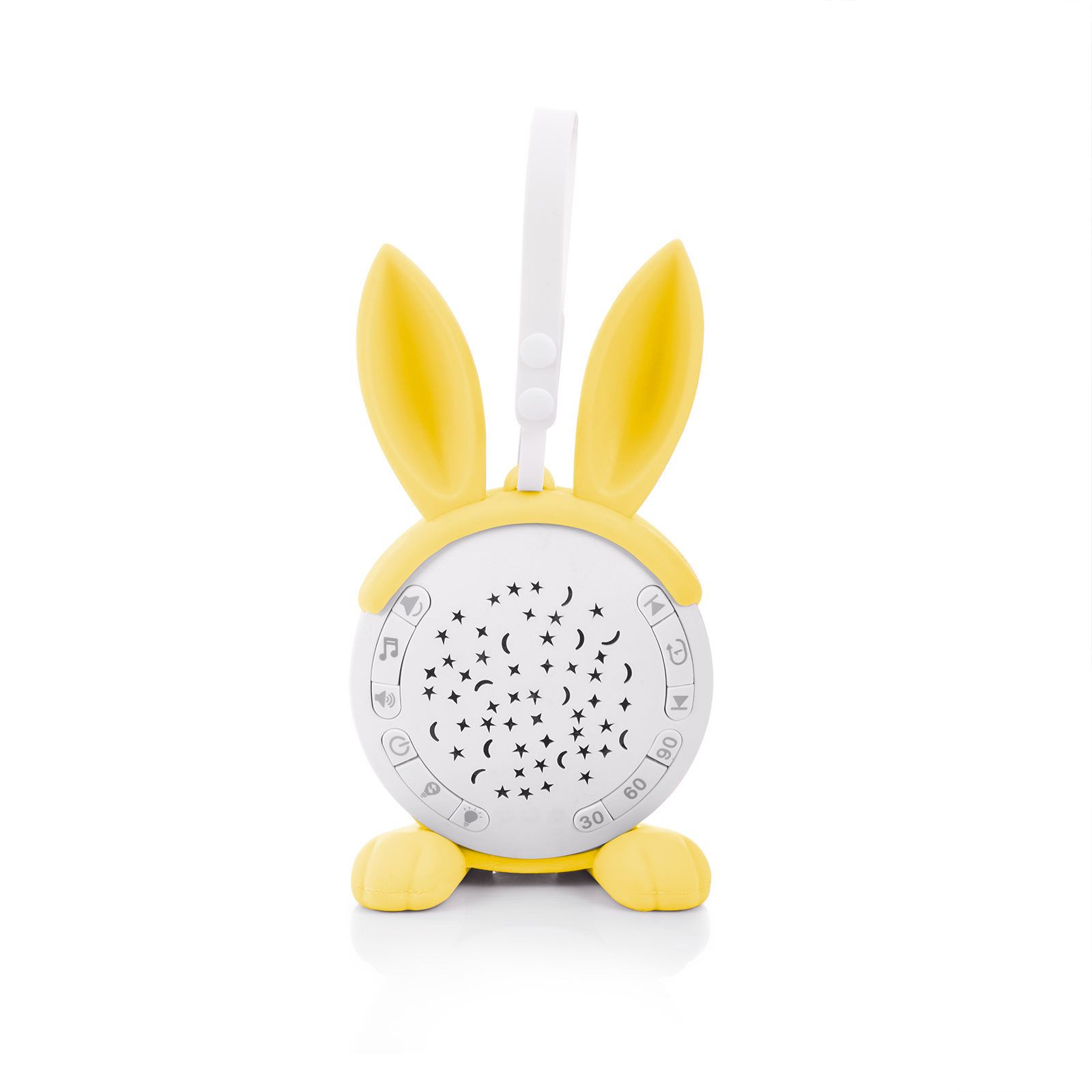 Възможност за закрепване към детско легло/кошара, детска количка, люлка за бебета и малки деца или стол за хранене посредством силиконов държач с формата на зайче;