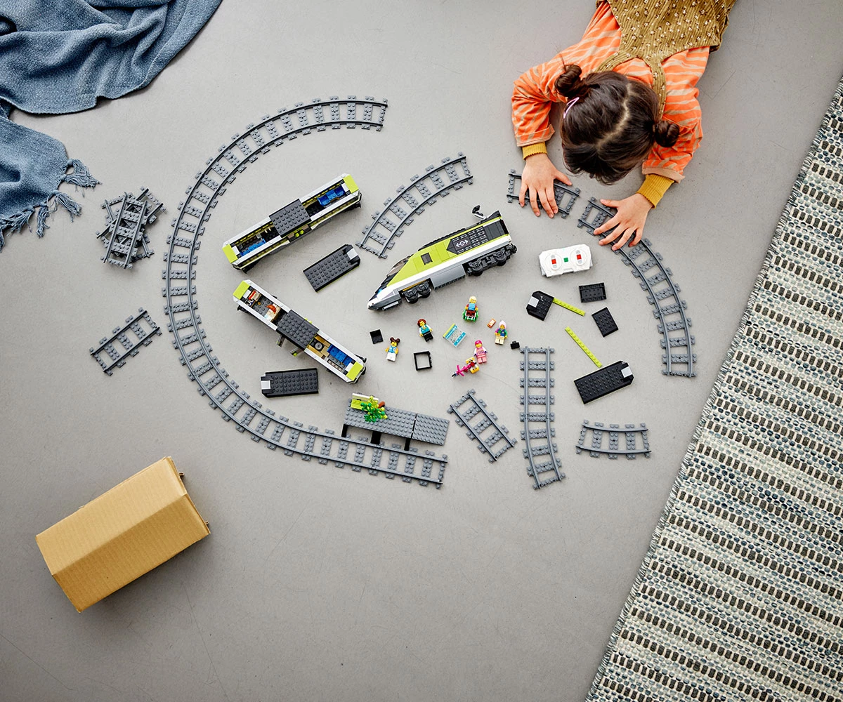 Включва 24 части за релси – LEGO® City Пътнически влак експрес се предоставя с 16 извити и 8 прави части за релси;