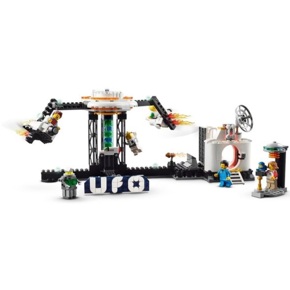 Комплектът съдържа извита писта с влакче в увеселителен парк, 3 движещи се колички, които могат да се приближат към космическата ракета, както и умалени модели на Сатурн и Земята, лунна база и падаща звезда;
