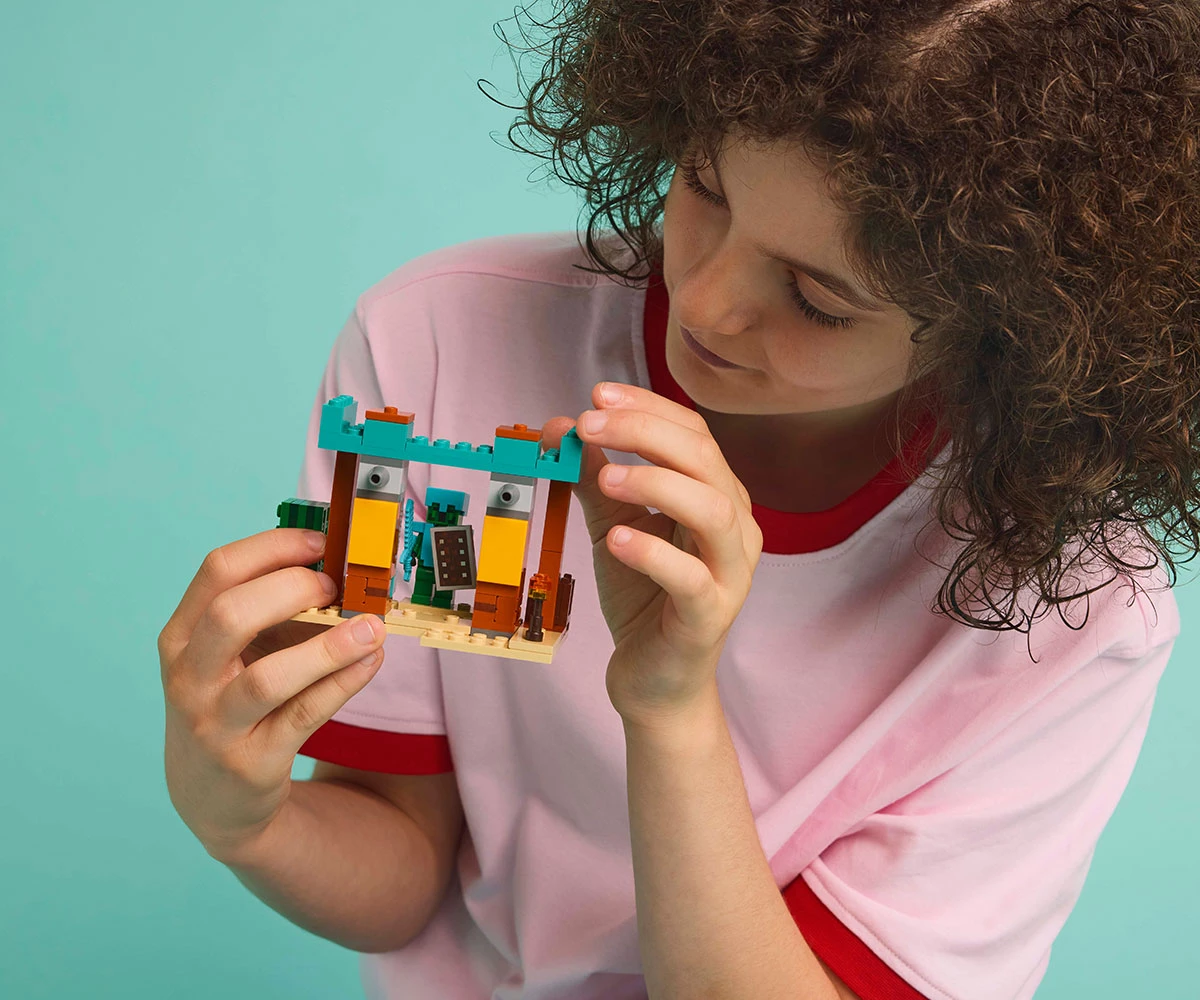 Гейминг играчка с пустинен замък – този малък комплект LEGO® за деца е пълен с боен екшън от Minecraft® за опазването на бъчва, пълна със съкровища;