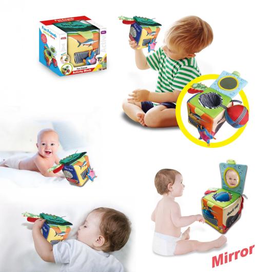 Изработен от меки и безопасни материали, кубът е подходящ за най-малките и предлага различни активности, които стимулират сетивата, фината моторика и логическото мислене;