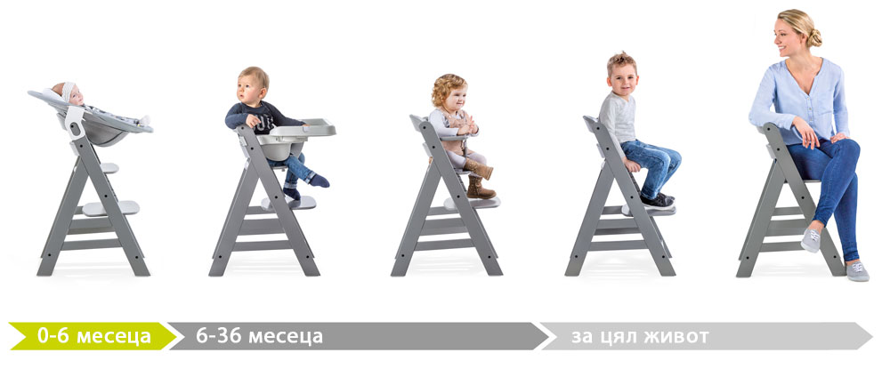 Имате възможност да го използвате от раждането на детето в комбинация с шезлонг Alpha /закупува се отделно/. По този начин бебчо ще може да "сяда" на масата заедно с цялото семейство, а вие ще можете да го наблюдавата по-лесно и удобно;