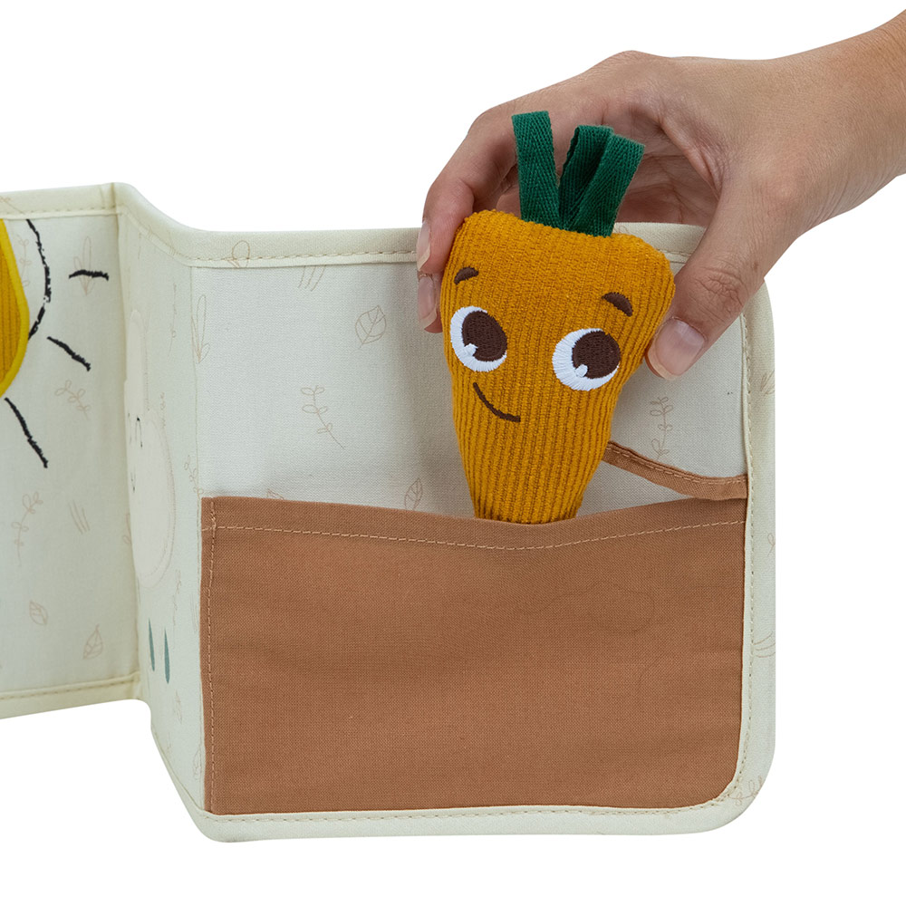 Текстилната книжка се сгъва компактно и съхранява лесно, за да е винаги подръка за игра в движение;