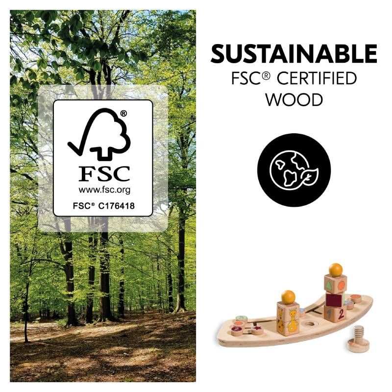 Таблата за игра е изработена от здрава дървесина, която е добита от FSC®-сертифицирани гори, за да се гарантира устойчиво и екологично използване на гората за опазване на околната среда;