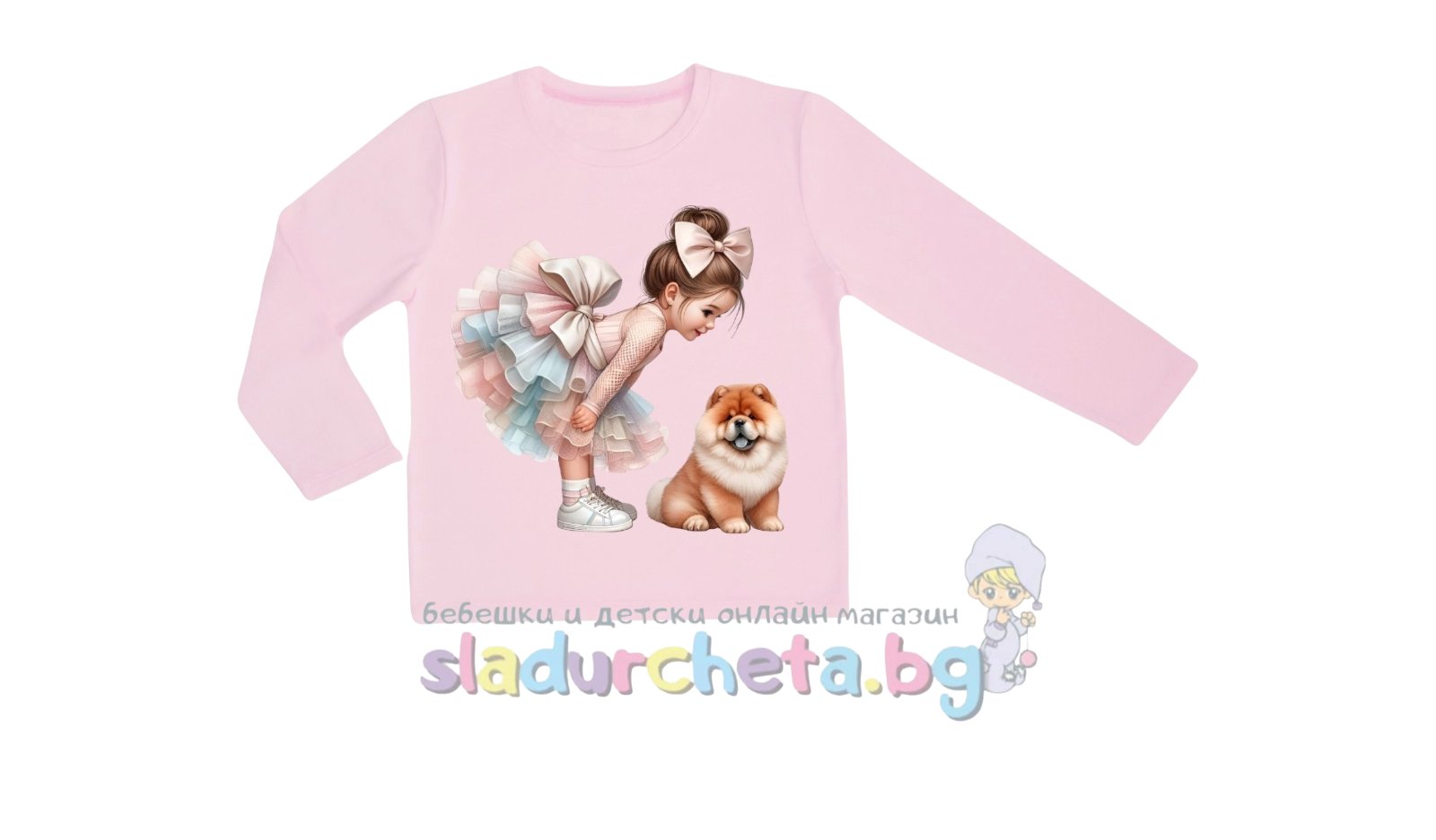 Блузата е с дълъг ръкав в светлорозов цвят с цветна картинка;