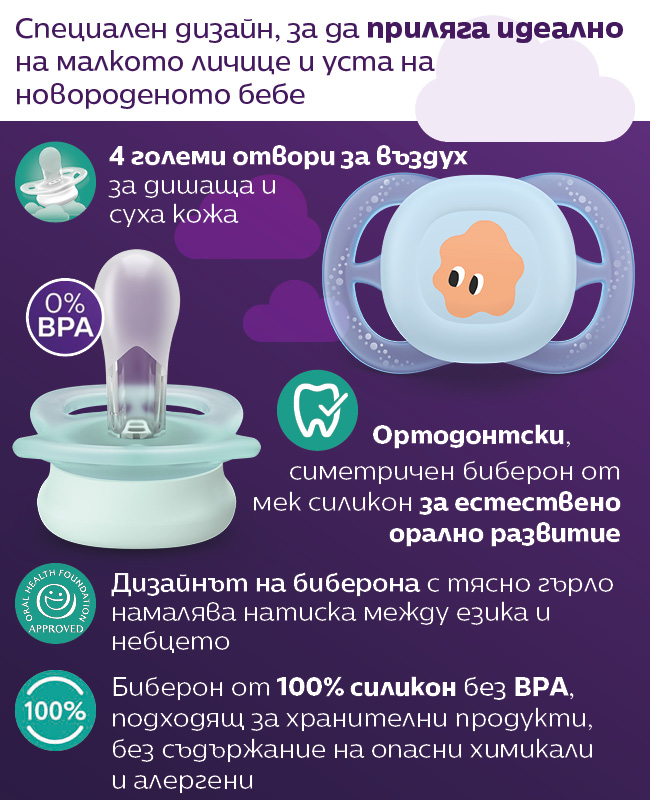 • Симетричен и мек силиконов биберон подпомага естествените движения на устните мускули и здравословното развитие на устната кухина на бебето;