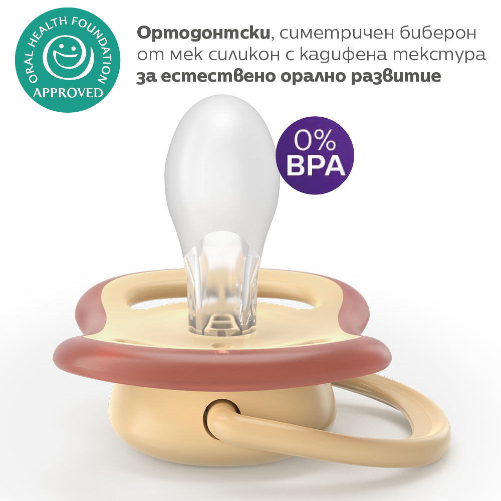Симетричен и мек силиконов биберон подпомага естествените движения на устните мускули и здравословното развитие на устната кухина на бебето;
