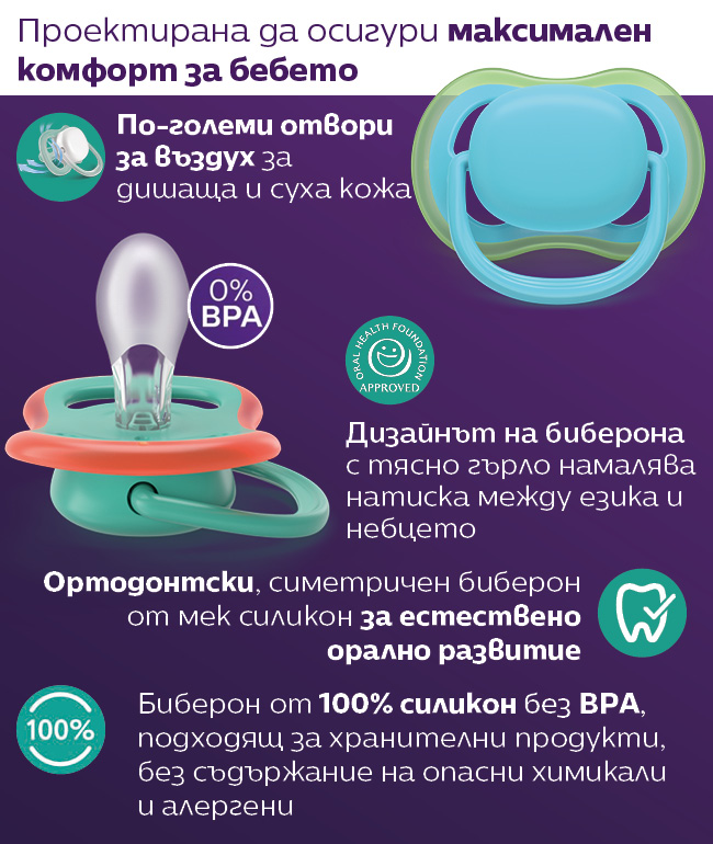 • Заоблени ръбове на основата на залъгалката Avent, за намаляване натиска върху кожата на бебето по време на сучене;
