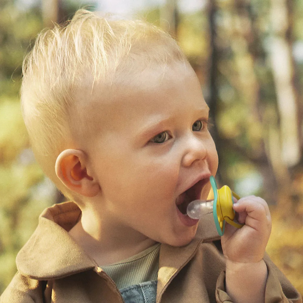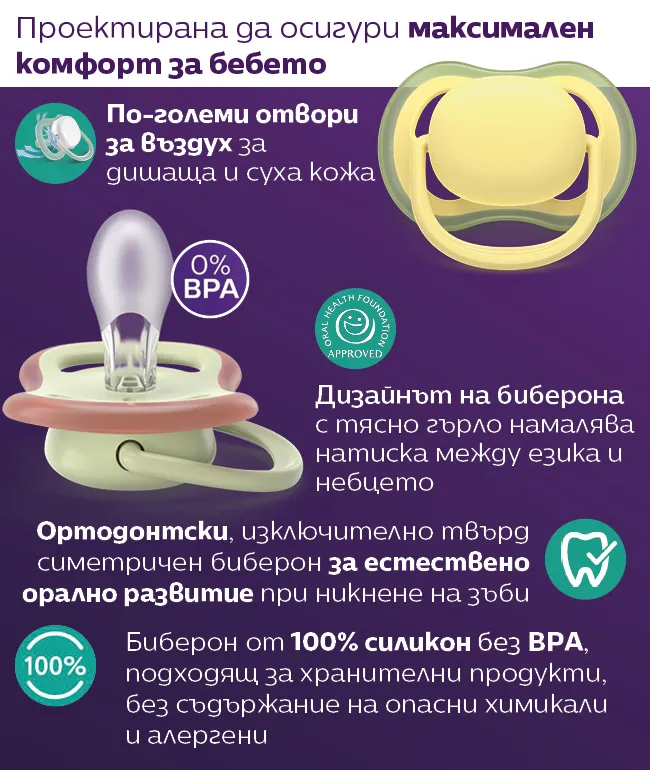 Симетричен и мек силиконов биберон подпомага естествените движения на устните мускули и здравословното развитие на устната кухина на бебето;