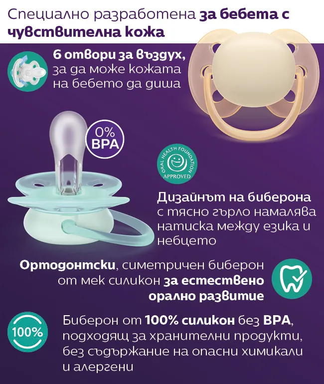 Симетричен и мек силиконов биберон подпомага естествените движения на устните мускули и здравословното развитие на устната кухина на бебето;