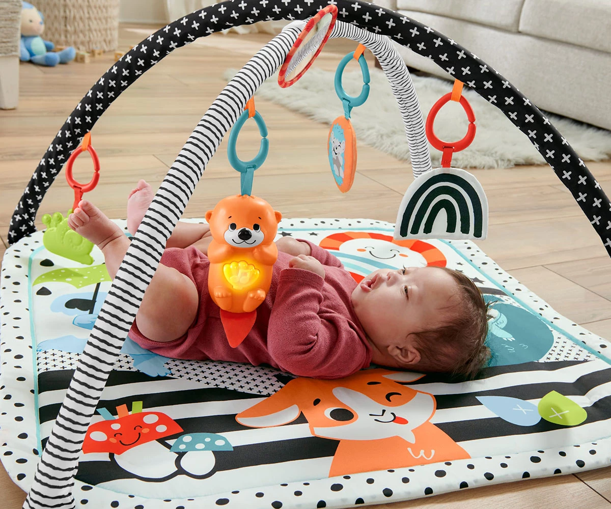 Включва 5 сензорни играчки: видра със светлини и музика, огледалце, дрънкалка таралежче, гризалка охлювче без BPA и двустранна шумоляща дъга;