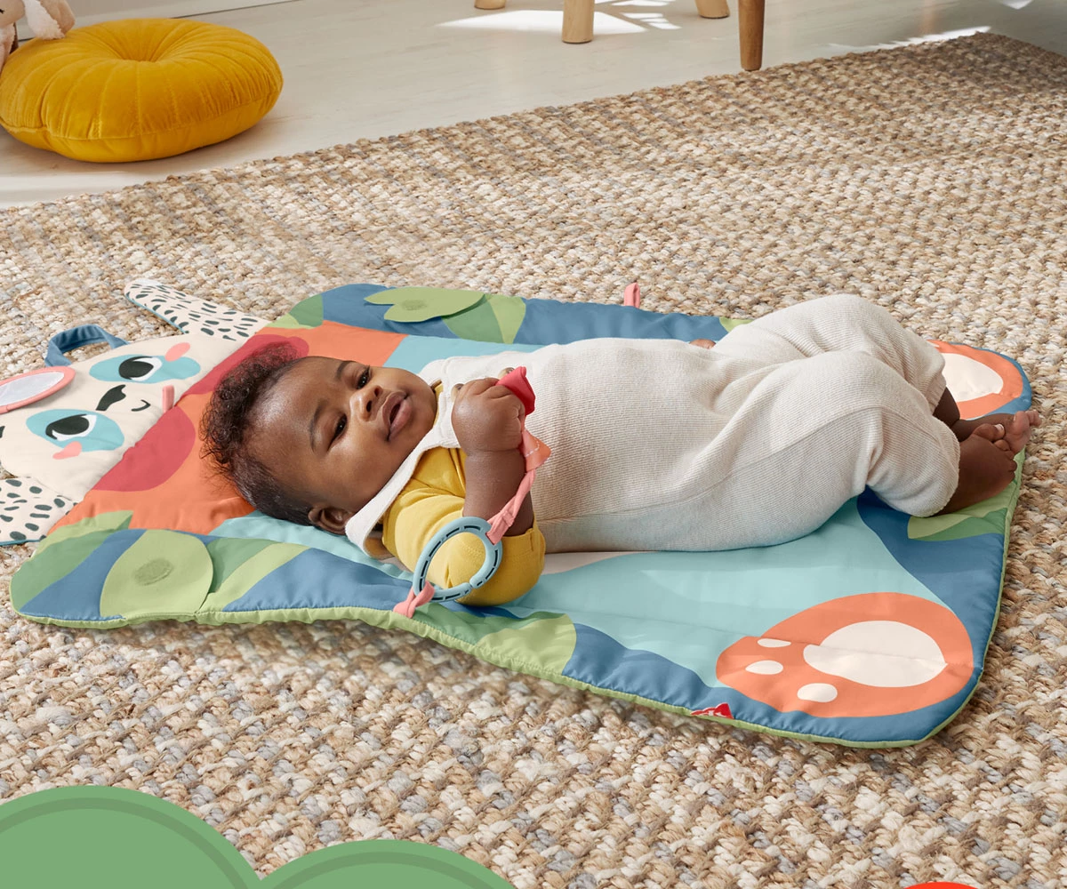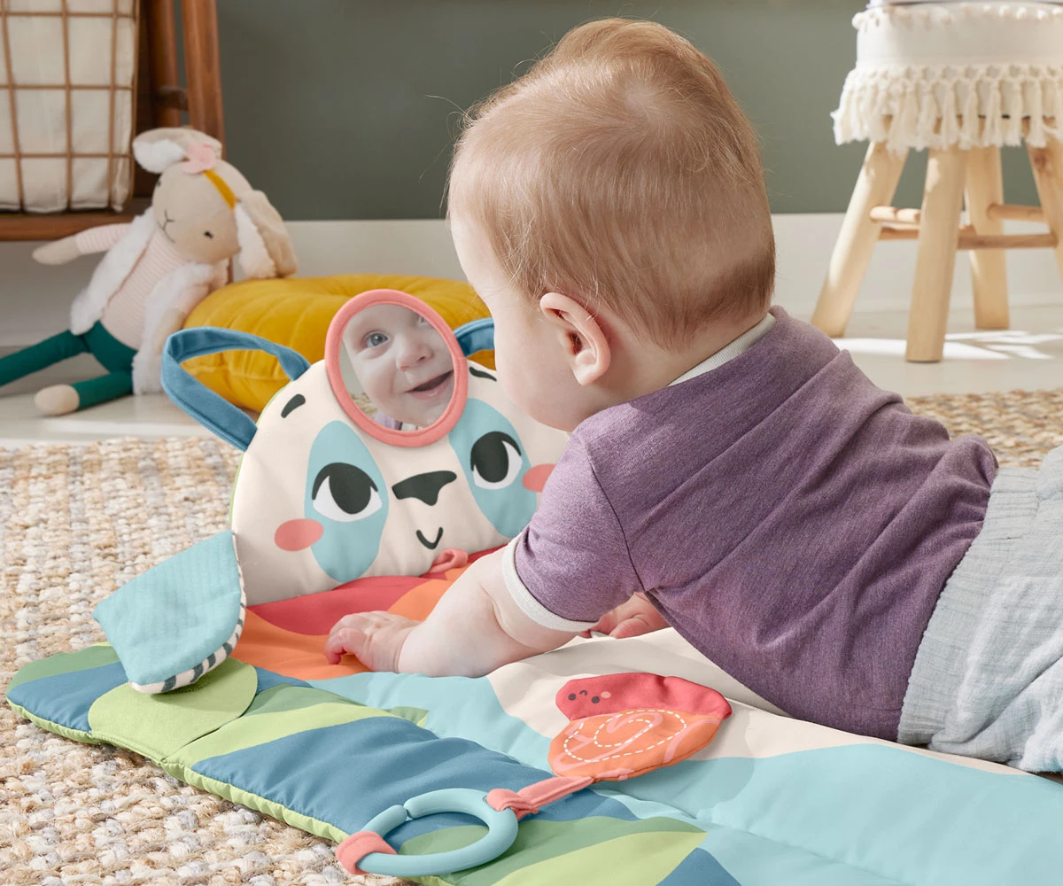Шумолящата играчка и огледалото за самооткриване се свързват с панела за времето за игра по корем или се прикрепят към малките дръжки отстрани, за да поддържате времето за игра свежо и забавно;