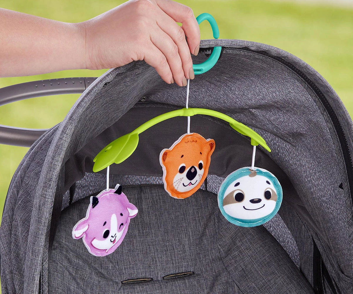 Разполага с 3 цветни и контрастни двустранни висящи животни, които развиват зрението на бебето;