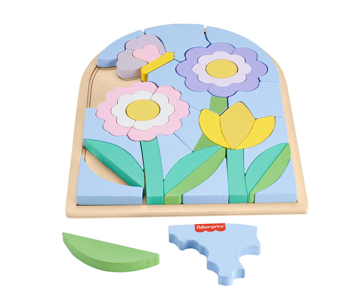 Този дървен пъзел с цветя от Fisher-Price позволява на децата да подреждат, сортират и създават забавни дизайни на цветя;