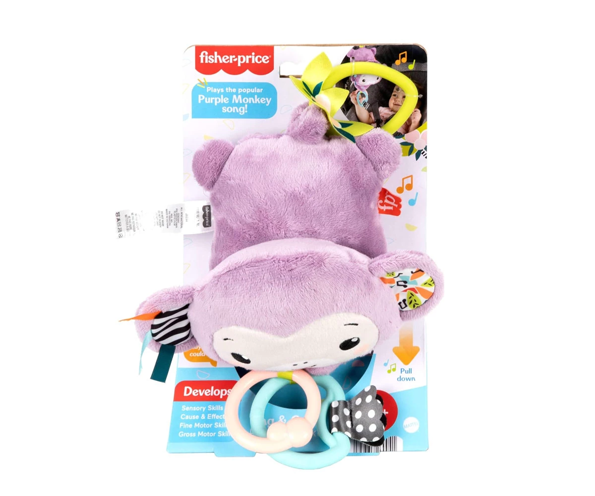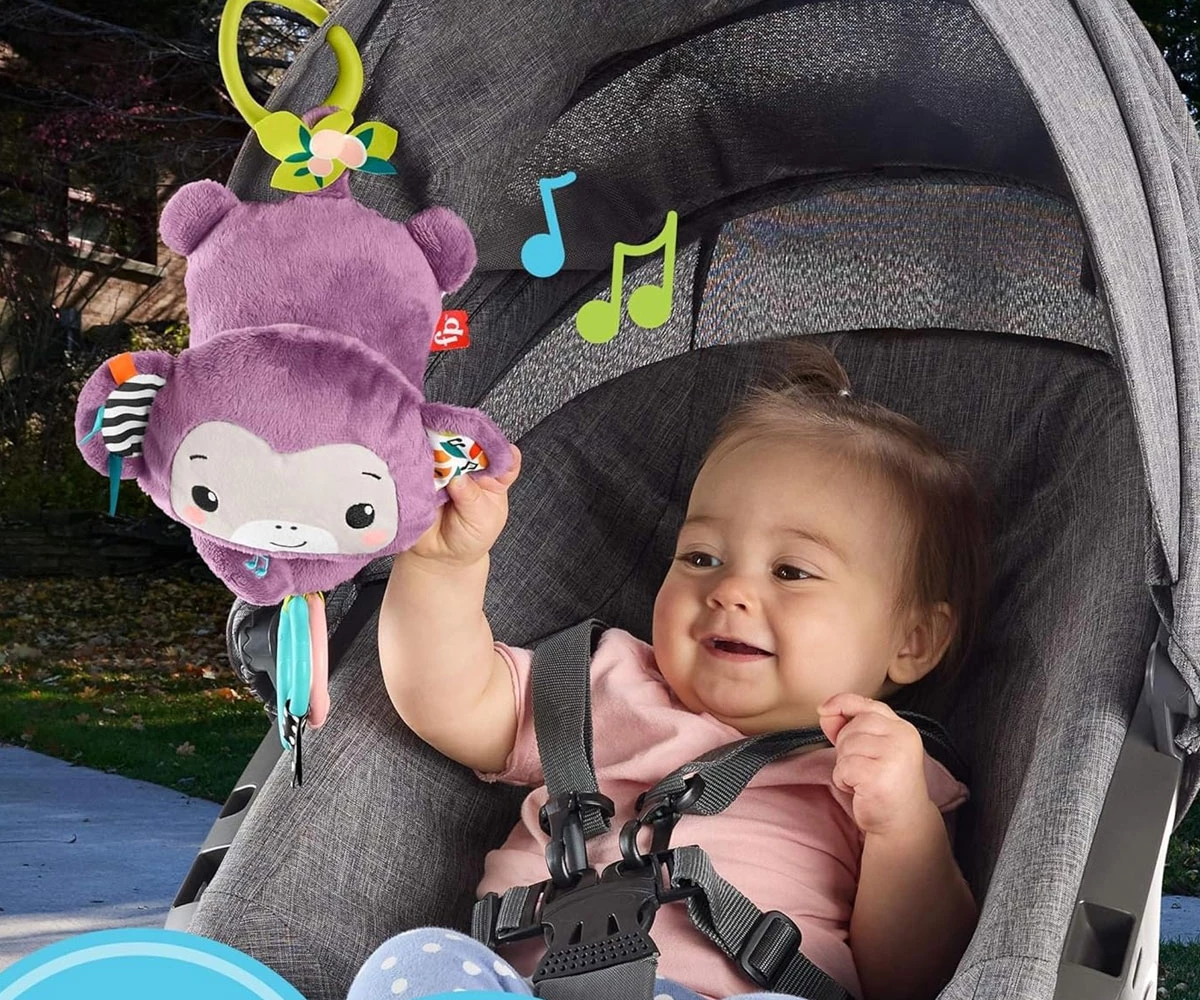 Вземете любимата мелодия на вашето бебе навсякъде с играчката за количка, която включва популярната мелодия на Лилавата маймуна от най-продавания Deluxe Kick & Play Piano Gym;