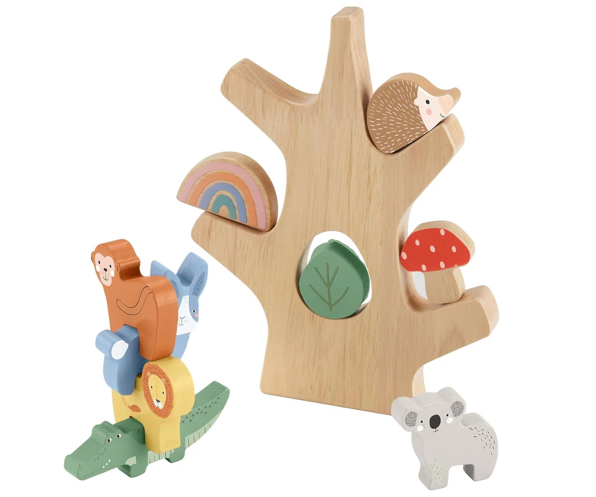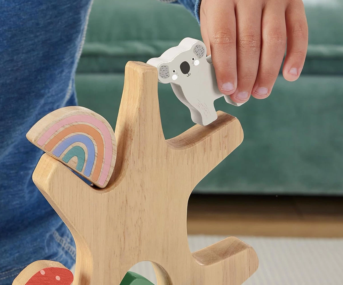 Този дървен комплект за игра включва 9 забавни блока, които децата могат да подреждат един върху друг или да балансират на клоните на дървото;