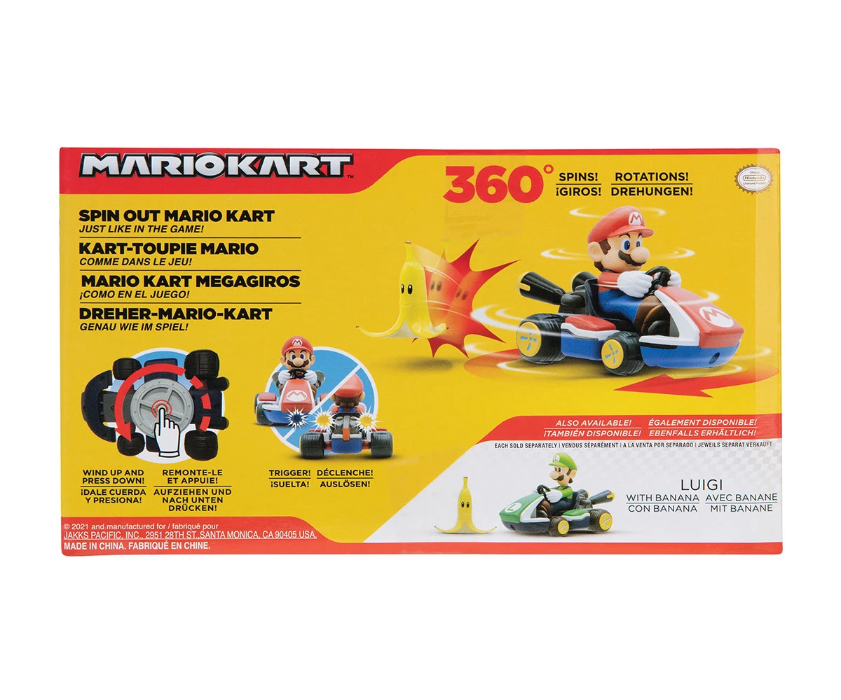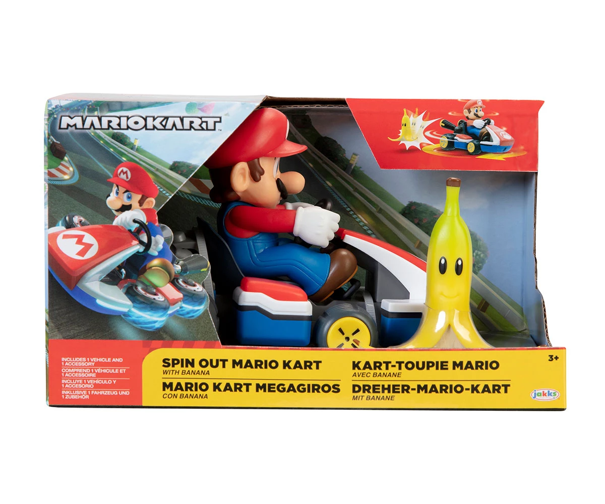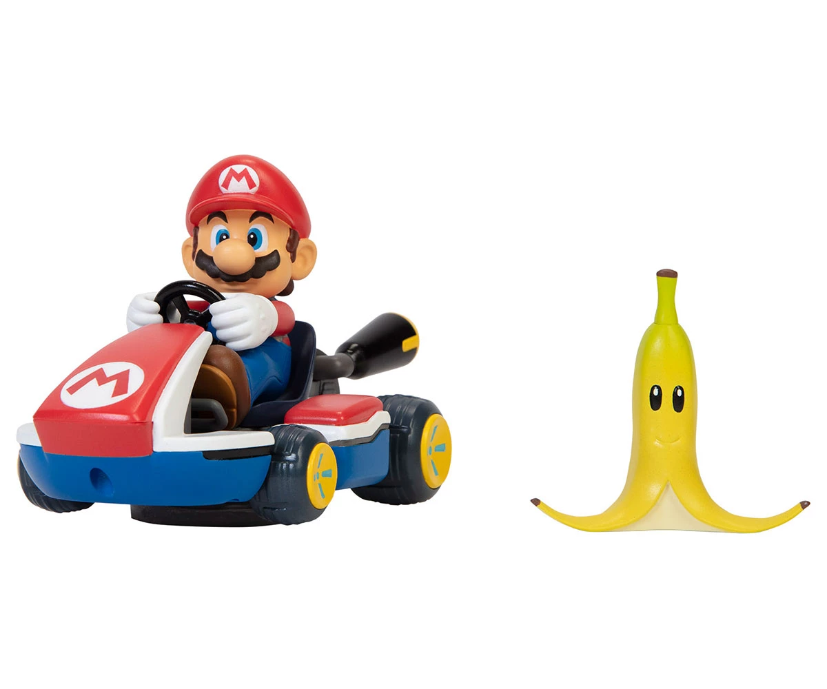 Завърти колата, натисни надолу и гледай как Марио се завърта на 360° при контакт с банановата кора – точно като в играта;