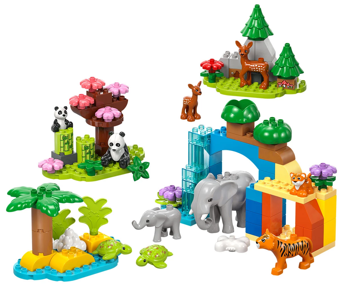 Играчка за въображение с десет диви животни LEGO® DUPLO® за творческо създаване на истории – включва фигури на тигър, слон, елен и панда, всяка с бебе, и две фигури на костенурки;