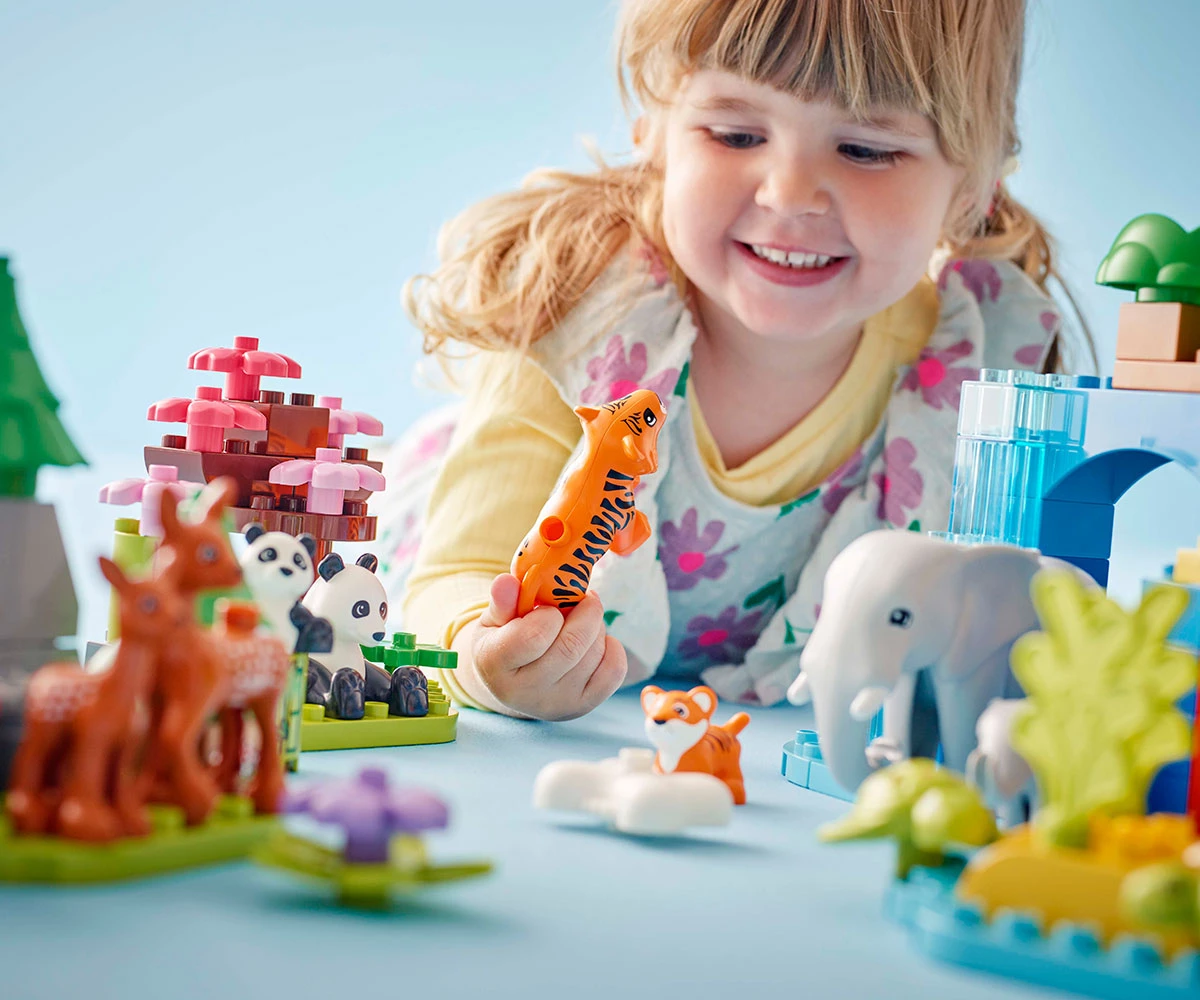 Природната играчка учи на грижовни взаимоотношения – малките деца изследват къде живеят животните с фигурите LEGO® DUPLO®, какво ядат и как се грижат за малките си;
