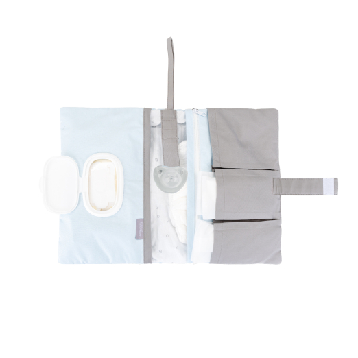 Отделение с отвор за мокри кърпи, джоб за памперси, джоб с цип и 3 отворени джоба за принадлежности;