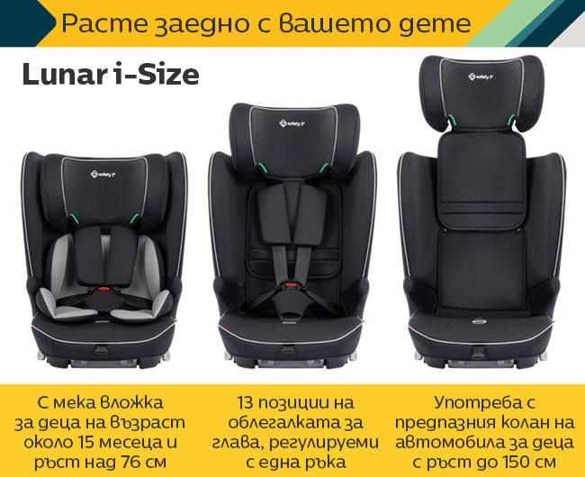 За да бъде всяко пътуване приятно, Lunar i-Size разполага с удобно легнало положение (1 позиция на наклона на облегалката) и вградена възглавница за намаляване на натоварването;