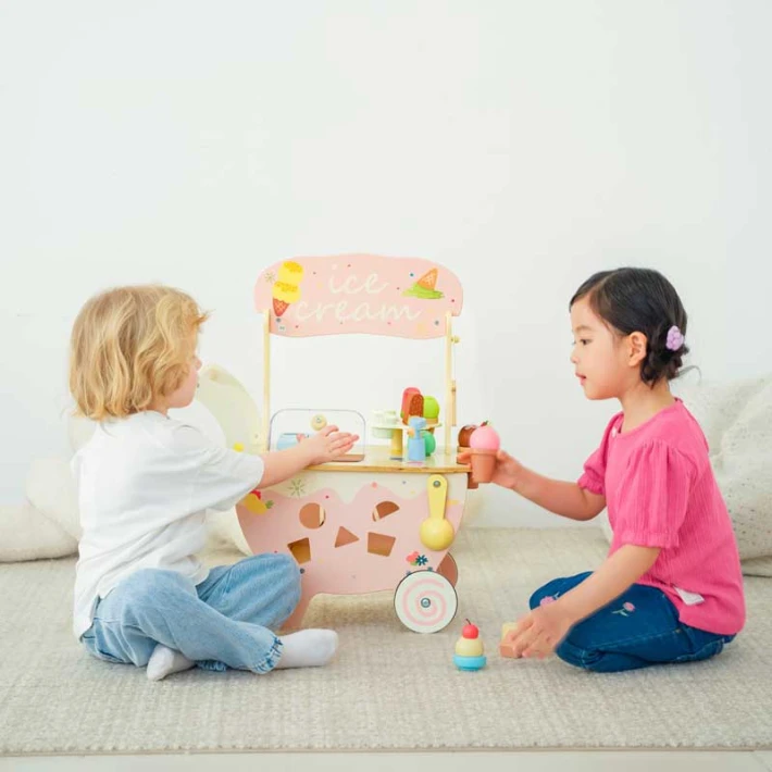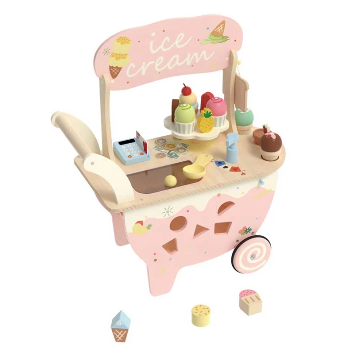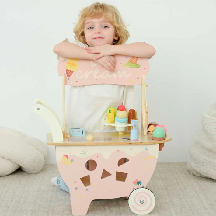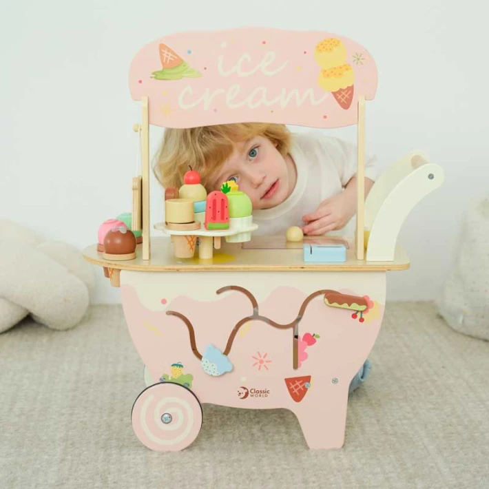 Удобна дръжка за бутане, което позволява на детето да я движи свободно из стаята – точно като истински уличен продавач на сладолед;