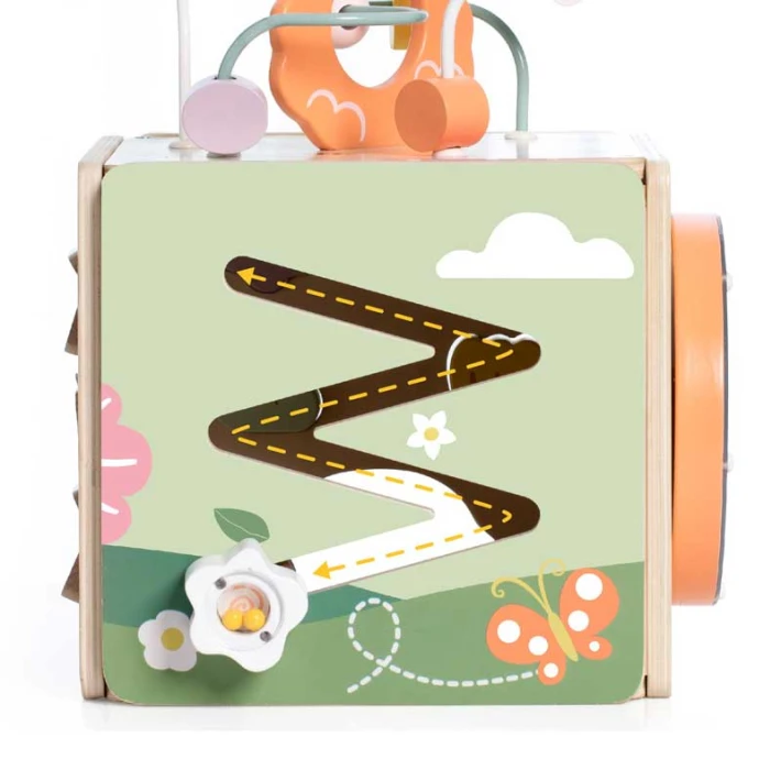 • Играчката включва елементи за плъзгане, въртене и проследяване, които стимулират координацията и фината моторика;
