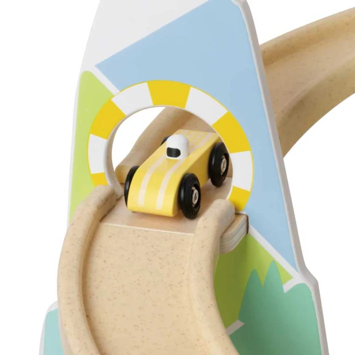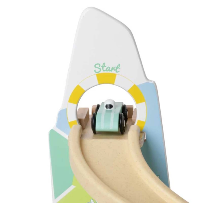 Пистата е проектирана така, че да насърчава активното участие – детето пуска количките от върха и проследява движението им по трасето;