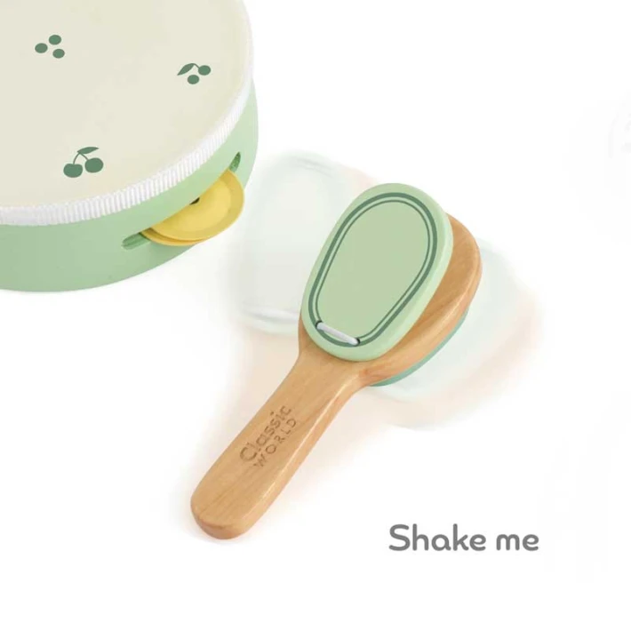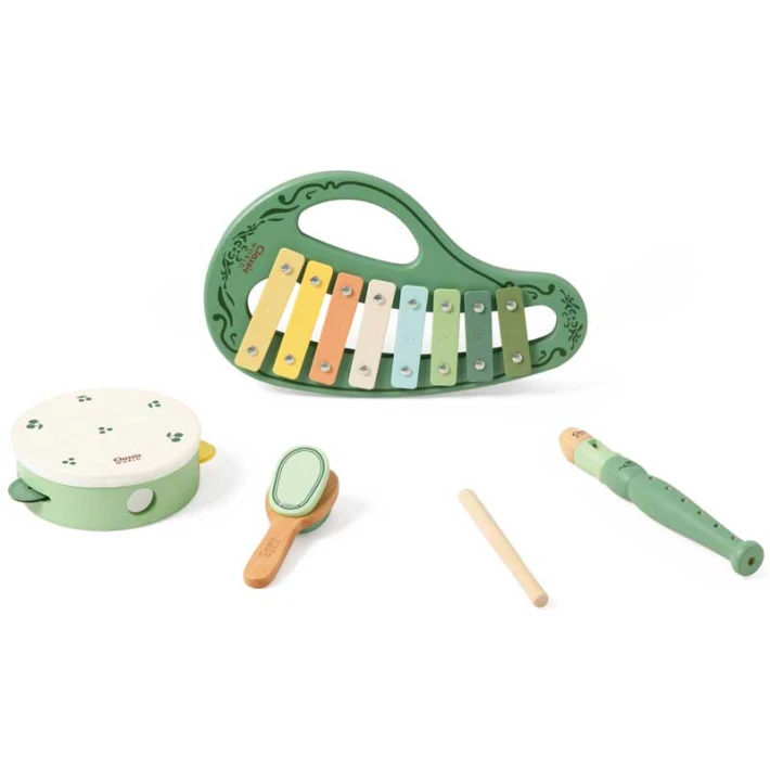Комплектът включва 5 части: ксилофон с дървена палка, тамбура, свирка и хлопка, които позволяват на малките музиканти да експериментират със звуци, ритъм и мелодии;