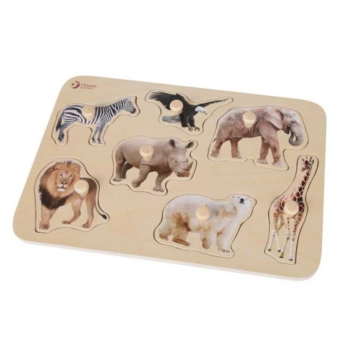 7 дървени пъзел елемента с диви животни – лъв, зебра, слон, жираф, носорог, полярна мечка и птица, които подпомагат разпознаването и ученето;