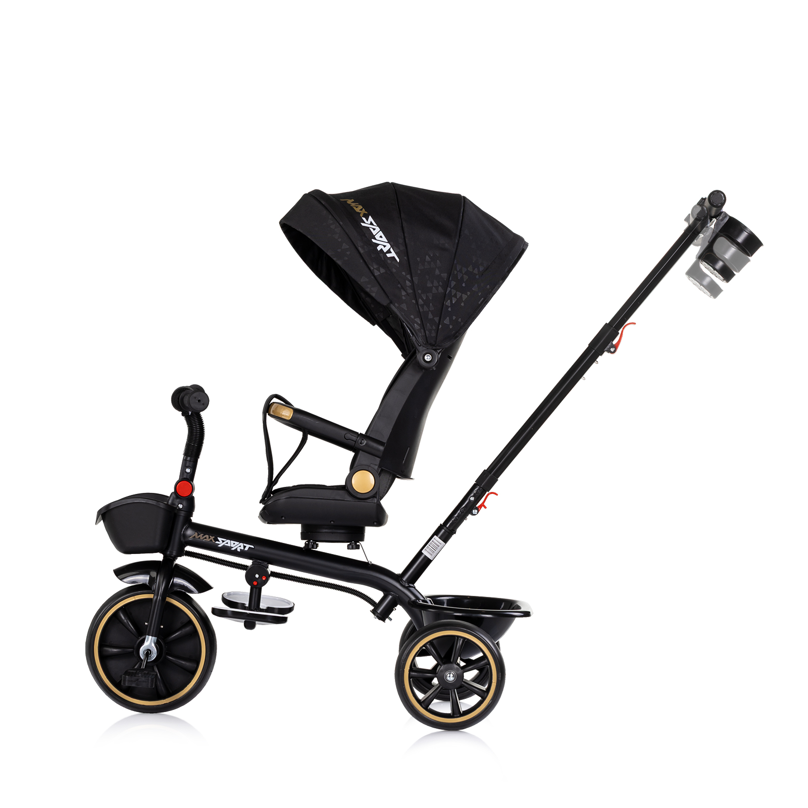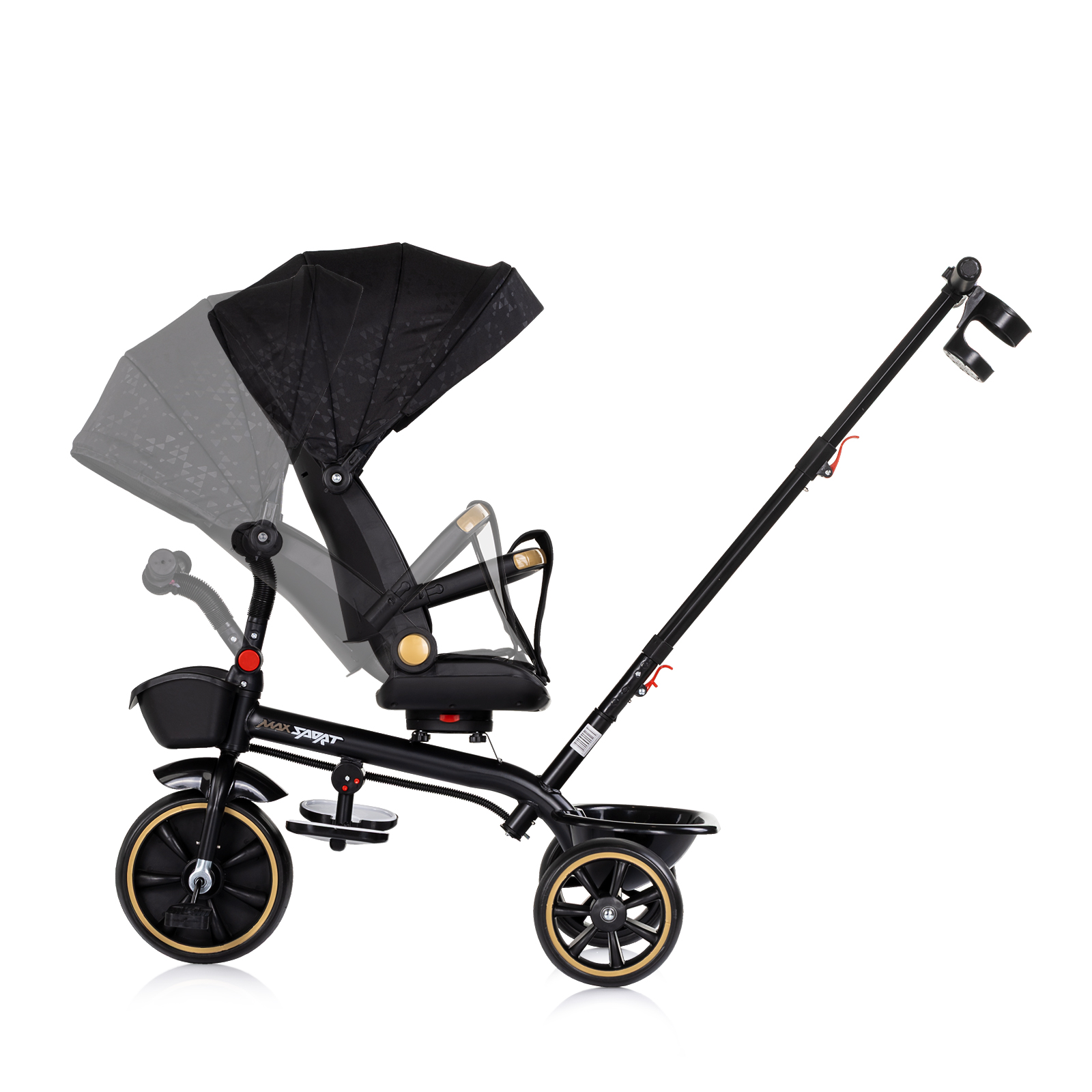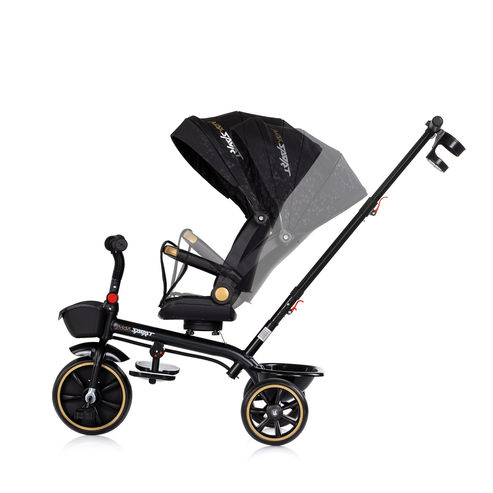 • Сенника, дръжката и предпазния борда се отстраняват и играчката се трансформира в триколка за по-голямо дете;