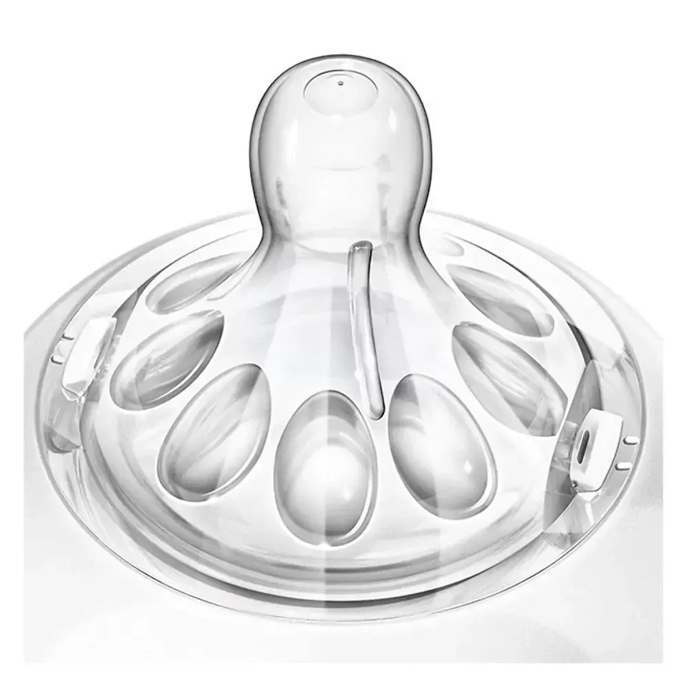 Допълнително омекотен биберон с бавен поток и матова текстура, наподобяващ формата на гърда, с широка периферия и венчелистчета, които увеличават мекотата и гъвкавостта, без сплескване;