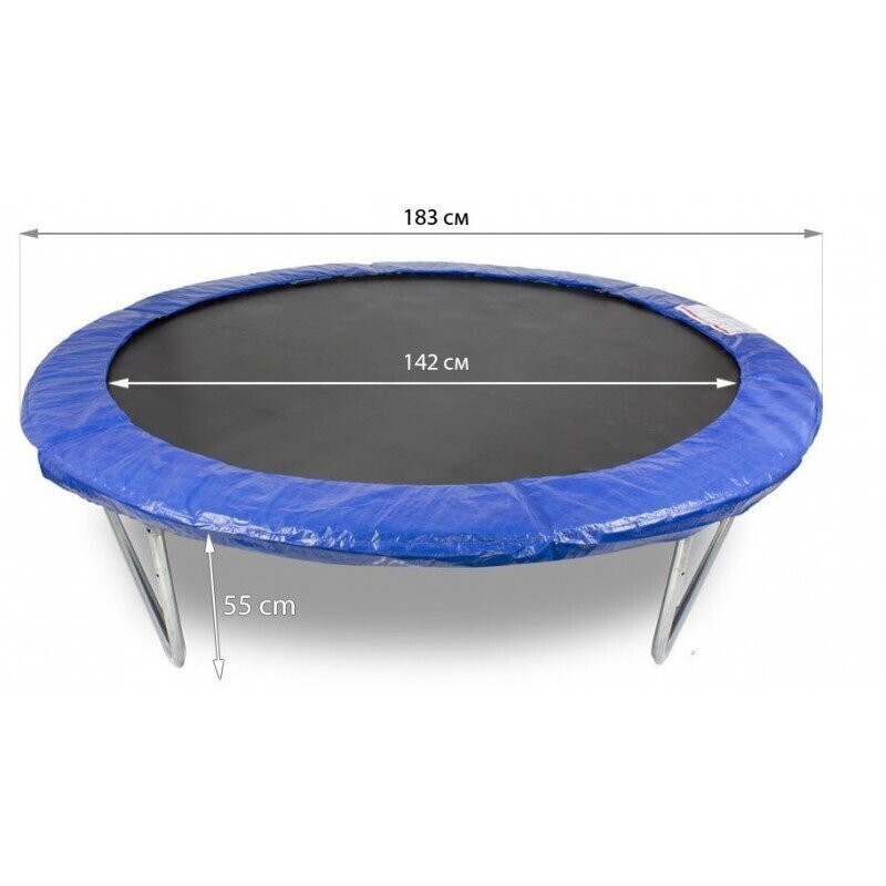Размери: - Общ диаметър: 183 cm - Площ за скачане: 142 cm - Обща височина: 235 cm от земята - Височина на предпазната мрежа: 180 cm за гарантирана безопасност - Височина на подложката за скачане: 55 cm от земята - Покривало за пружините с дебелина: 10 mm - Тръбите за които се закачат пружините са с дебелина 1.2 мм, което им придава по-голяма издръжливост на натоварване и им пречи да се деформират