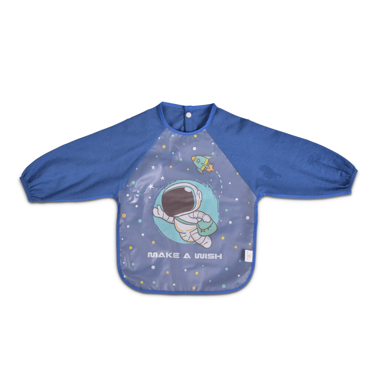 • Практичен дизайн с ръкави за да предпазва дрехите на детето да останат сухи и чисти по време на хранене и игра.