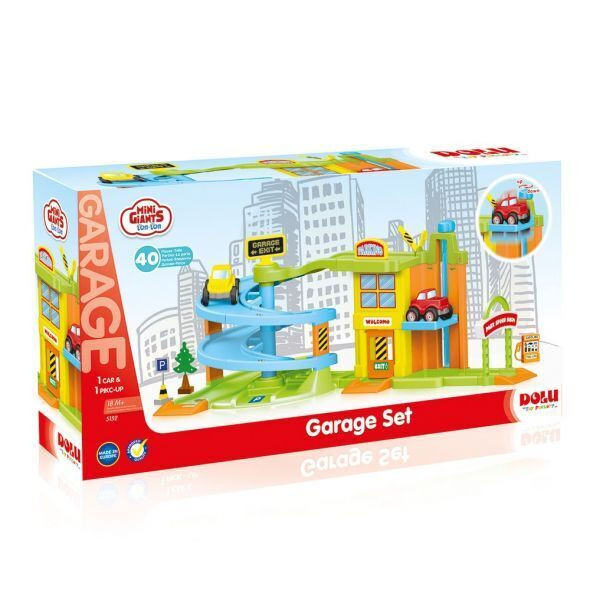 С писта за колички, гараж, асансьор с повдигаща се рампа, бензинова колонка за гориво и пътни знаци;