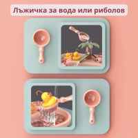 Поставете батерията, напълнете вода, натиснете бутона – започва да се върти. Патетата и рибките ще започнат да се движат наоколо, увеличавайки трудността на играта. Ако ще ви е по-лесно - използвайте лъжичката с дупки, а пък с другата си направете забавен водопад!;