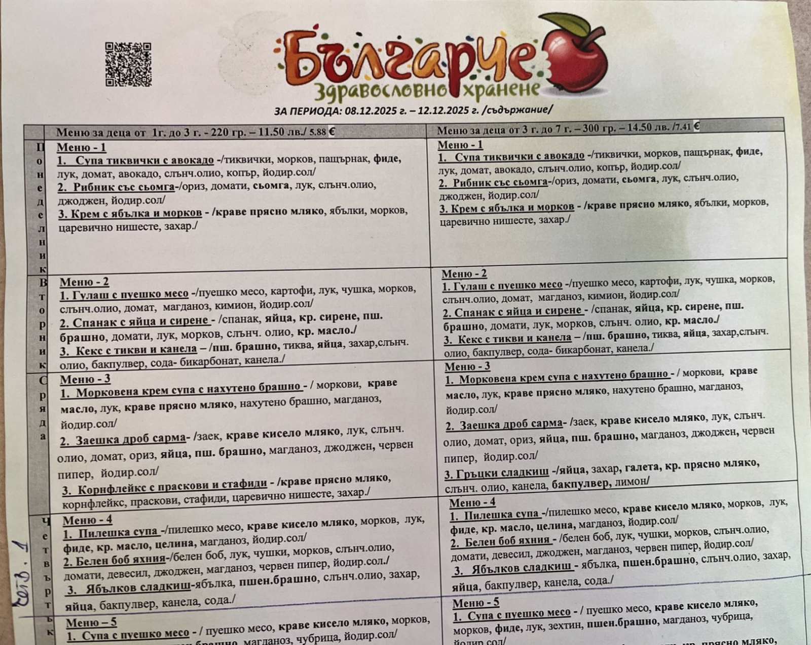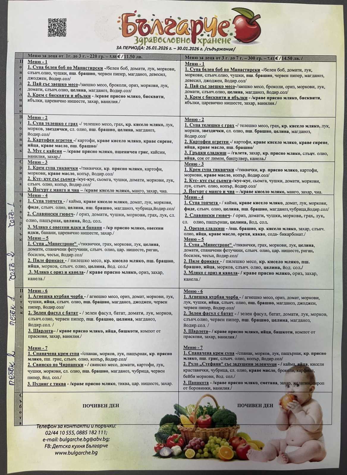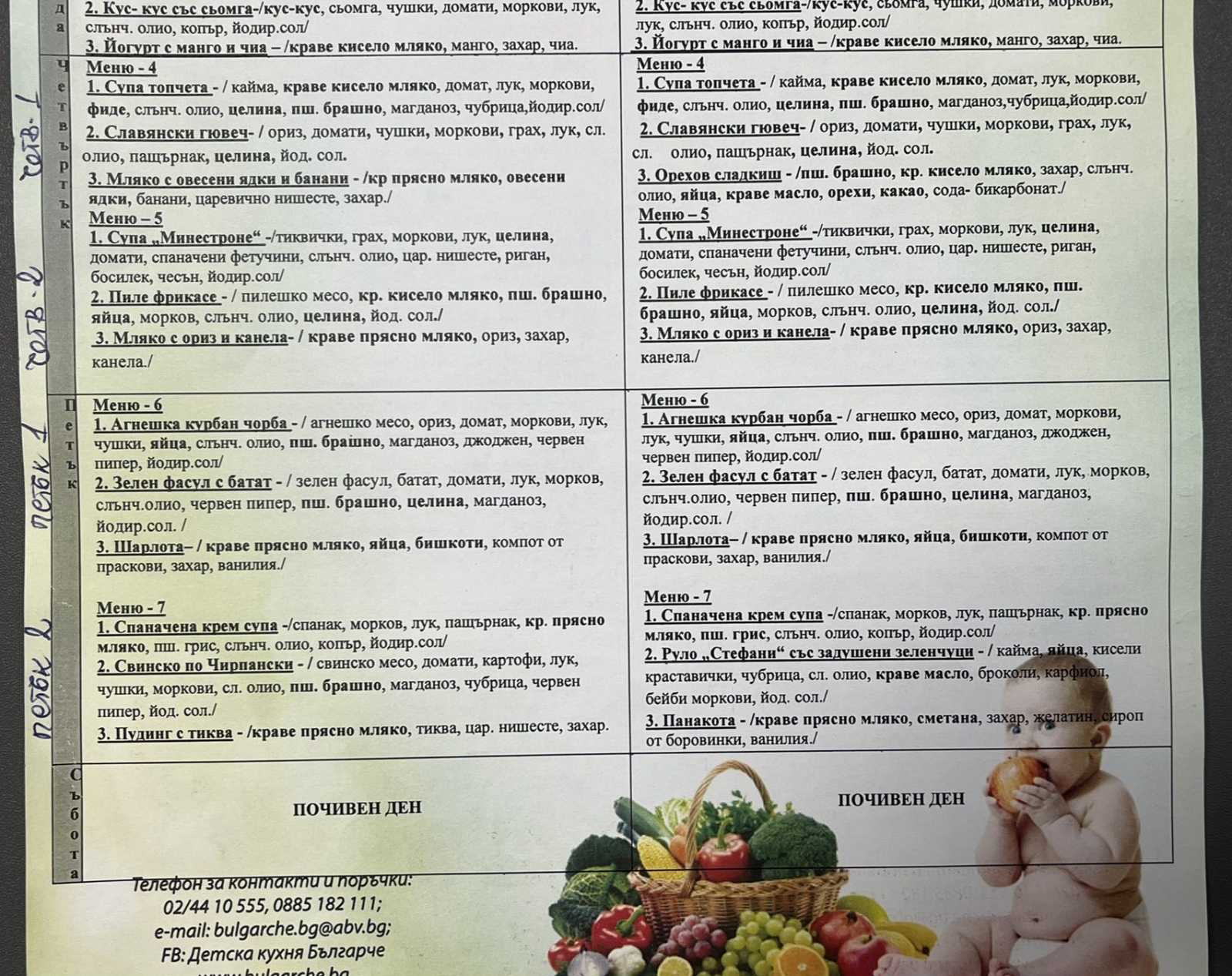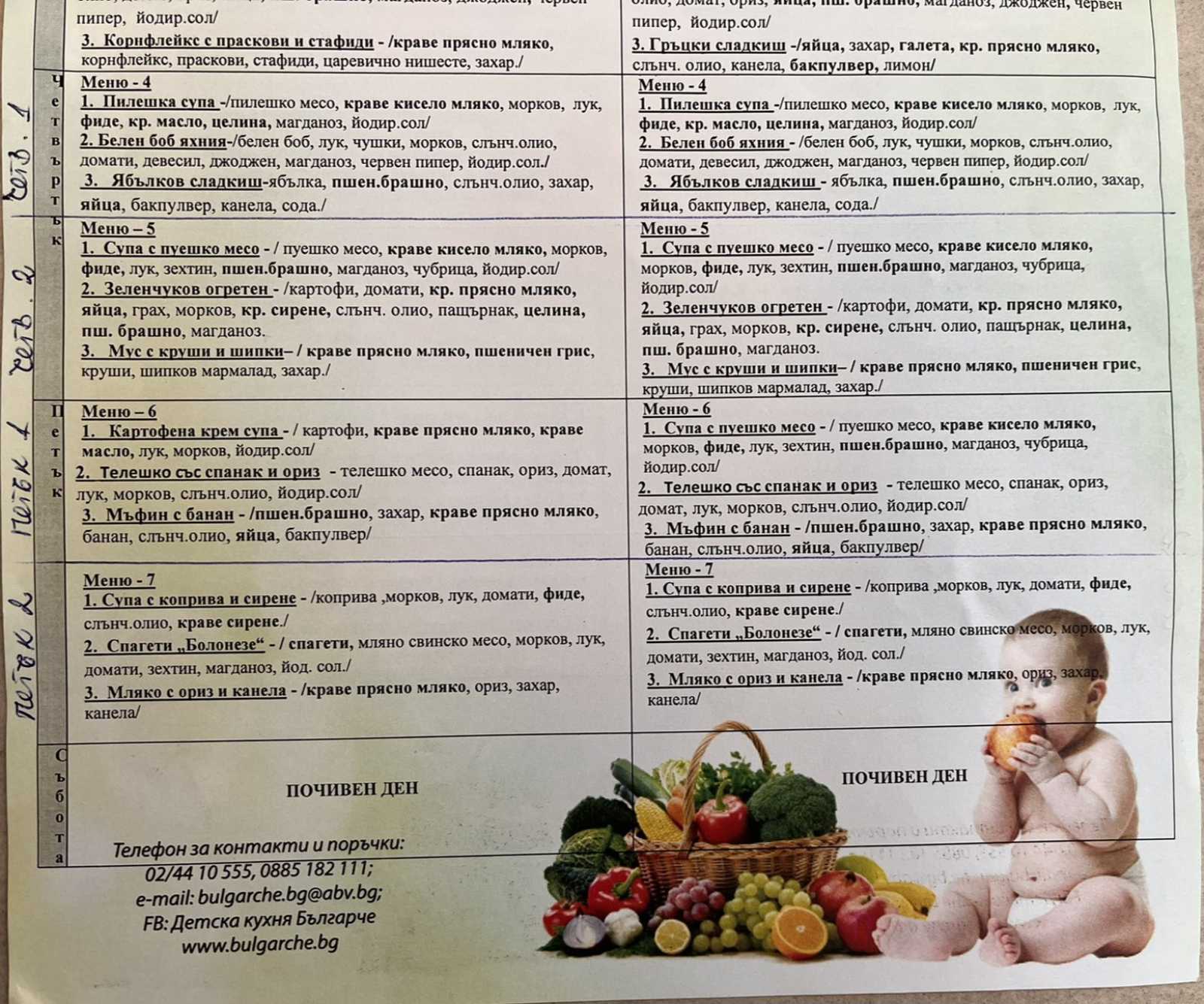 Съботните доставки са временно отменени от 01.06.2025г., детска кухня БЪЛГАРЧЕ ще предлага двойни менюта в четвъртък и в петък и за да няма объркване - моля отбелязвайте в поръчките дните от седмицата, които са в таблицата на менюто! В четвъртък се доставят менютата за четвъртък и петък, а в петък се доставят менютата за събота и неделя!