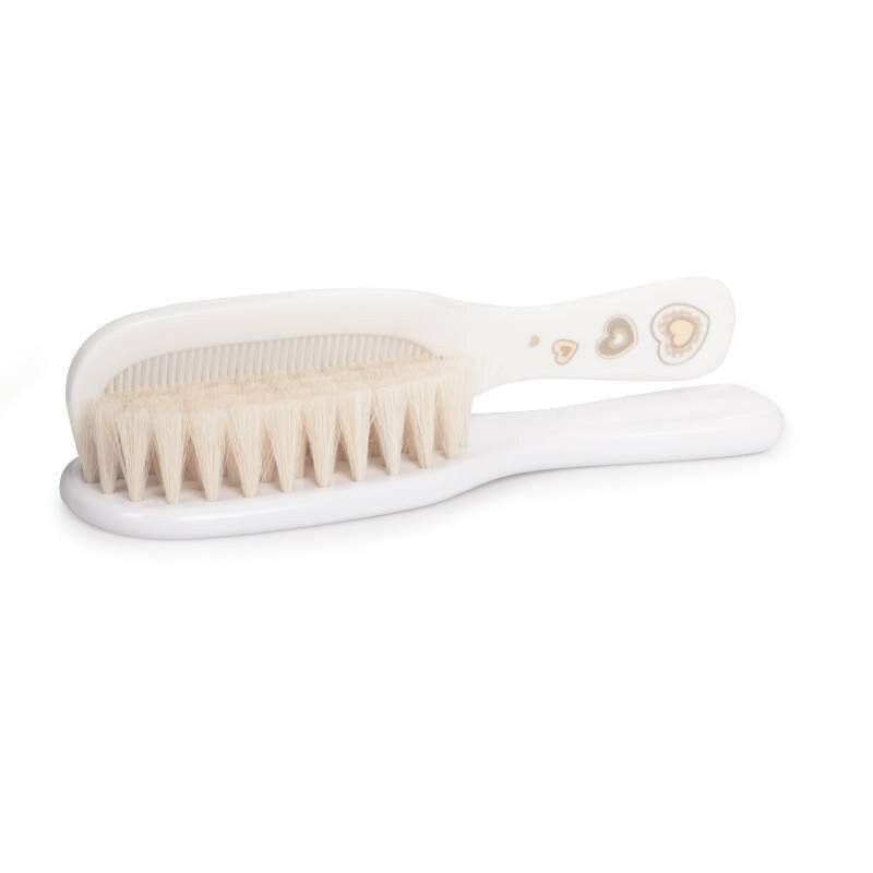 Комплектът включва: - гребен със заоблени зъби - мека четка с естествен косъм