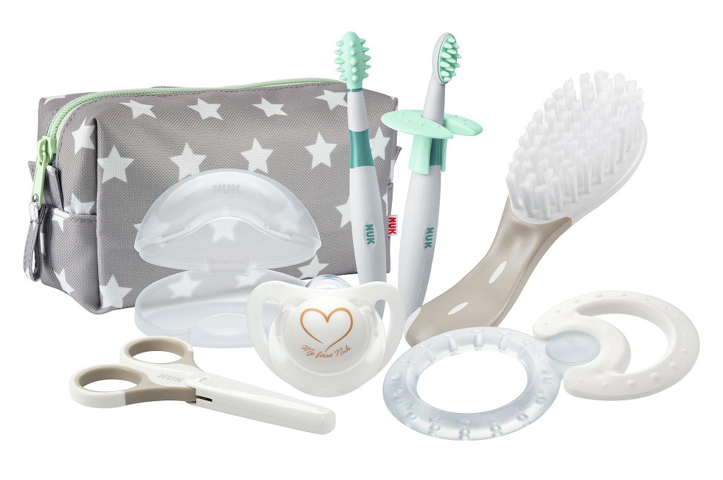 Комплектът включва: - Залъгалка Genius силикон 0-2 мес.; - Кутийка за залъгалка; - Ножичка с предпазно капаче; - Четка за коса - изкуствен косъм; - Чесалка 2бр 6+ мес; - Чесалка 2 ринга 3+ мес; - Текстилен несесер за хигиенично съхранение и транспортиране;