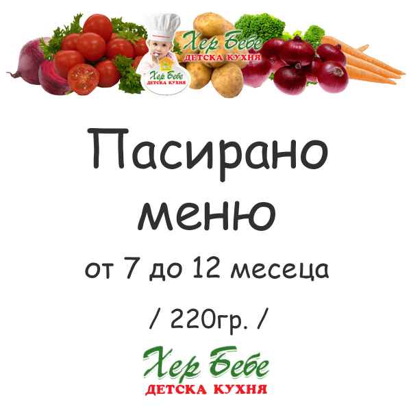 Менюто се състои от пасирани супа, основно и десерт - всяко по 220гр.