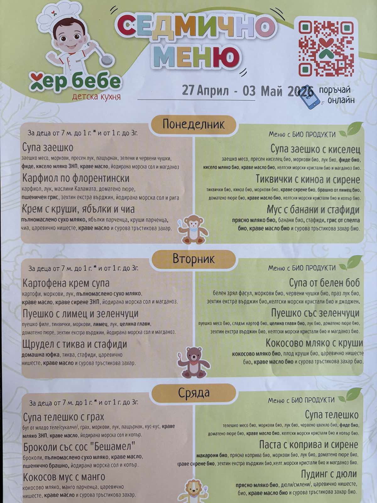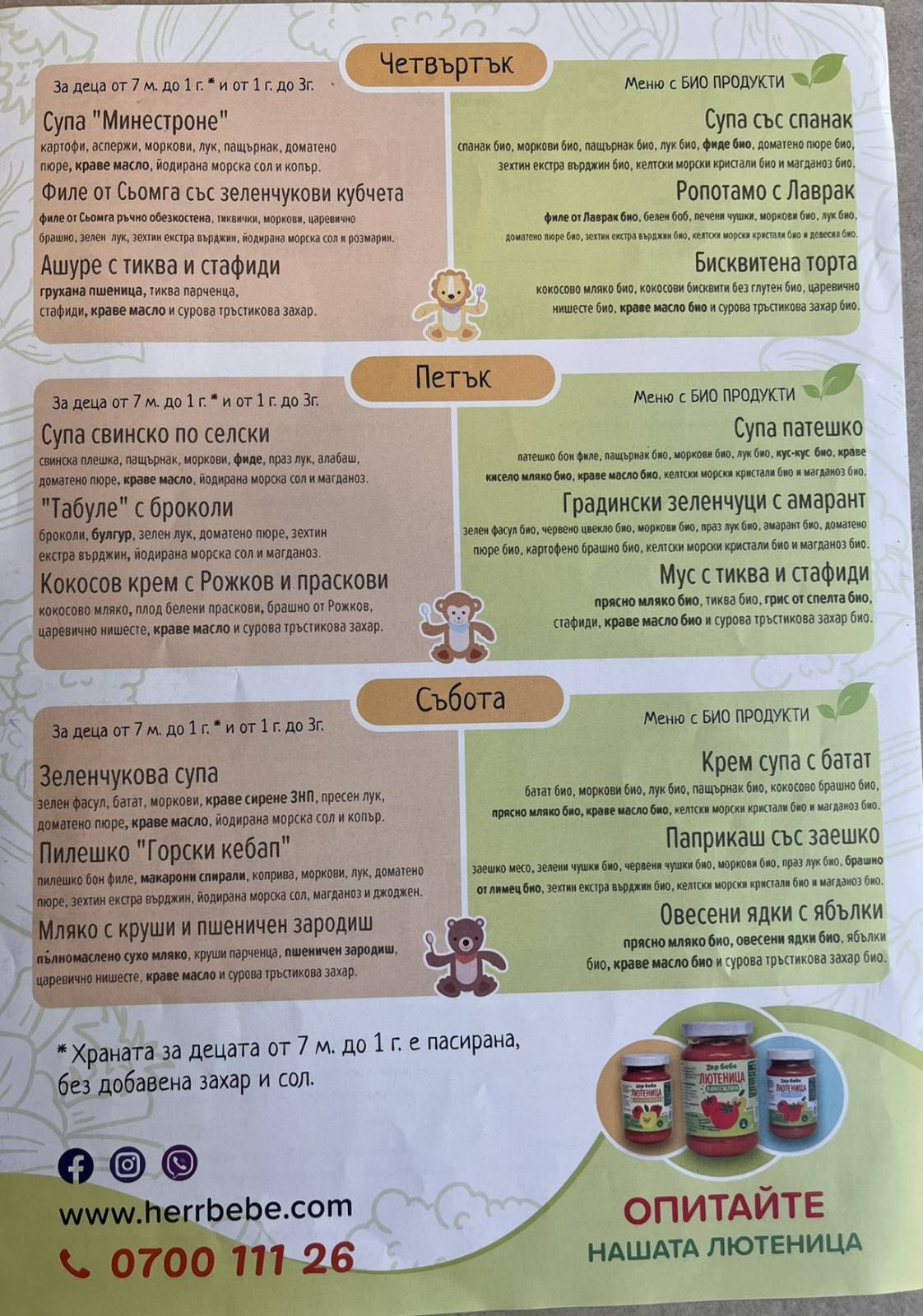 Менютата са съобразени изцяло с хранителния режим на децата Ви и техните калорийни нужди