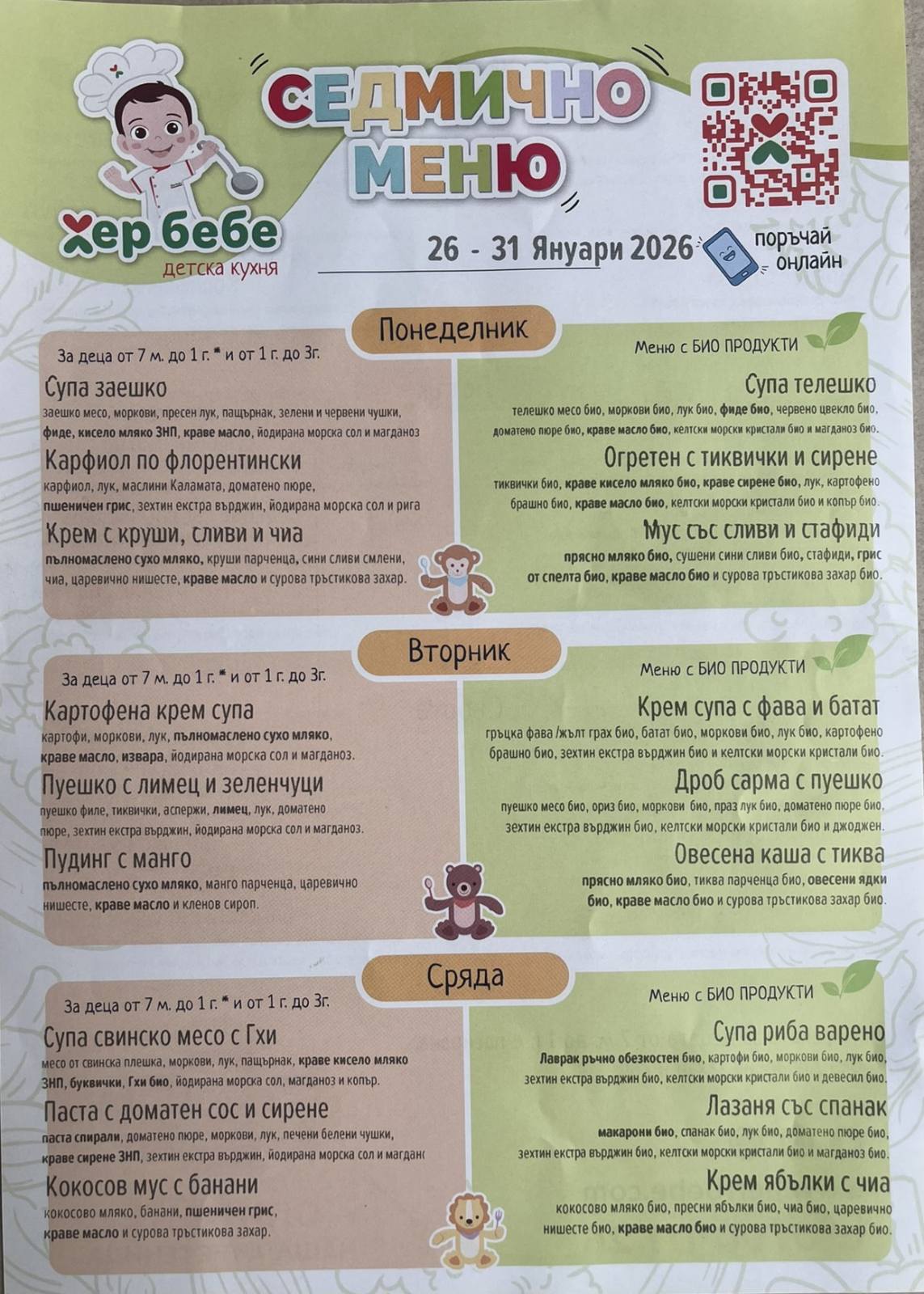 Менютата са съобразени изцяло с хранителния режим на децата Ви и техните калорийни нужди.
