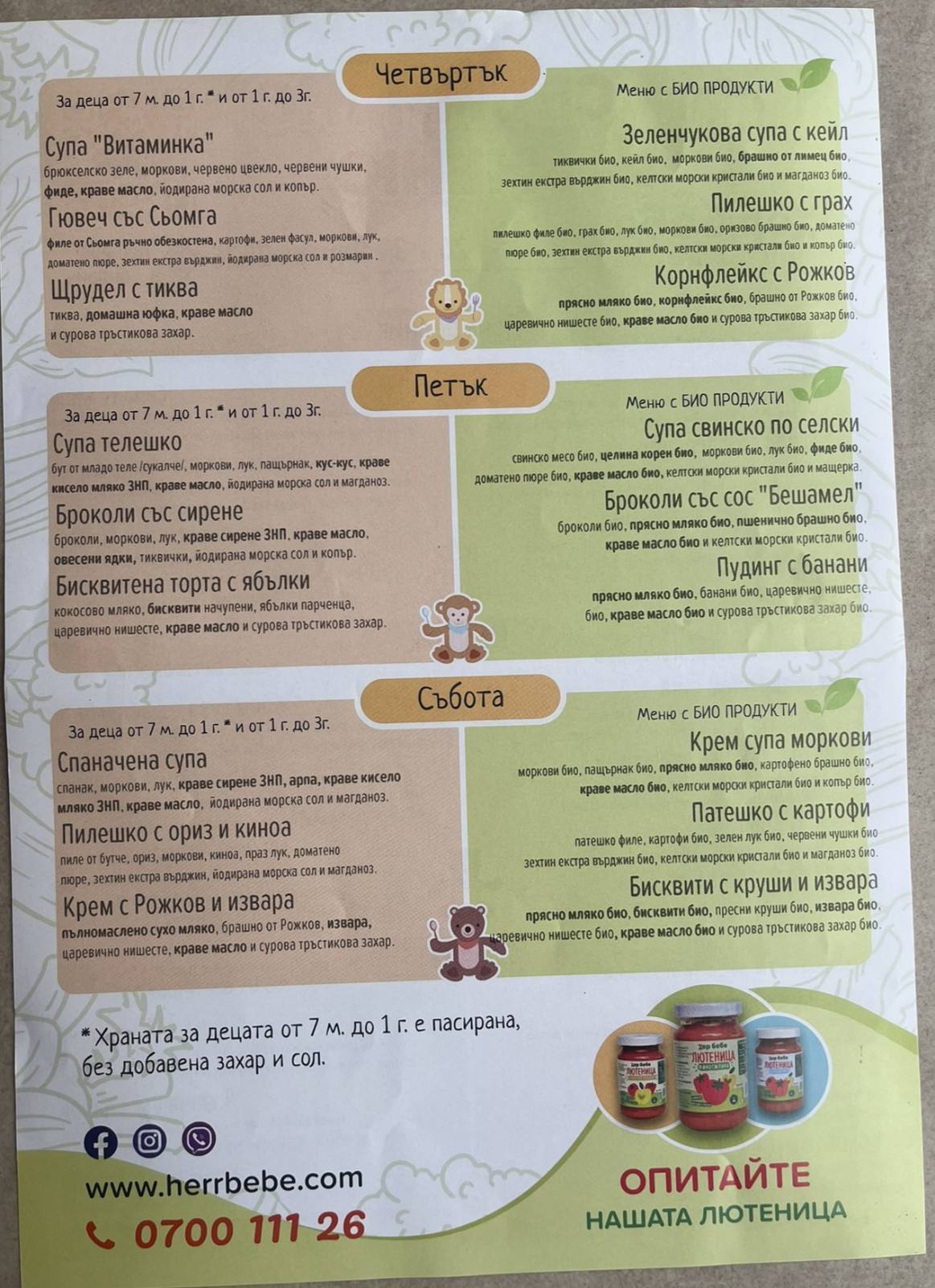 Менютата са съобразени изцяло с хранителния режим на децата Ви и техните калорийни нужди.