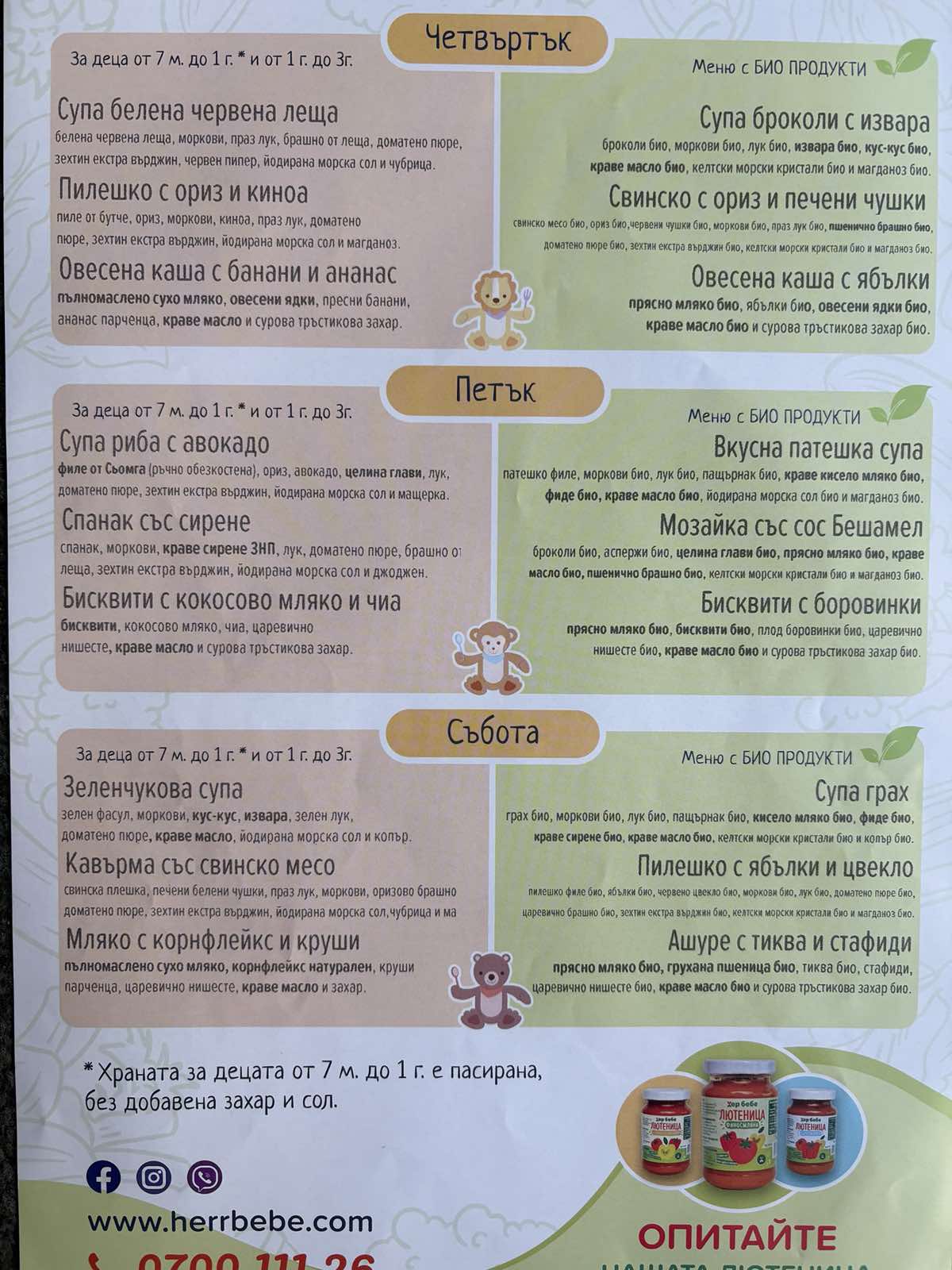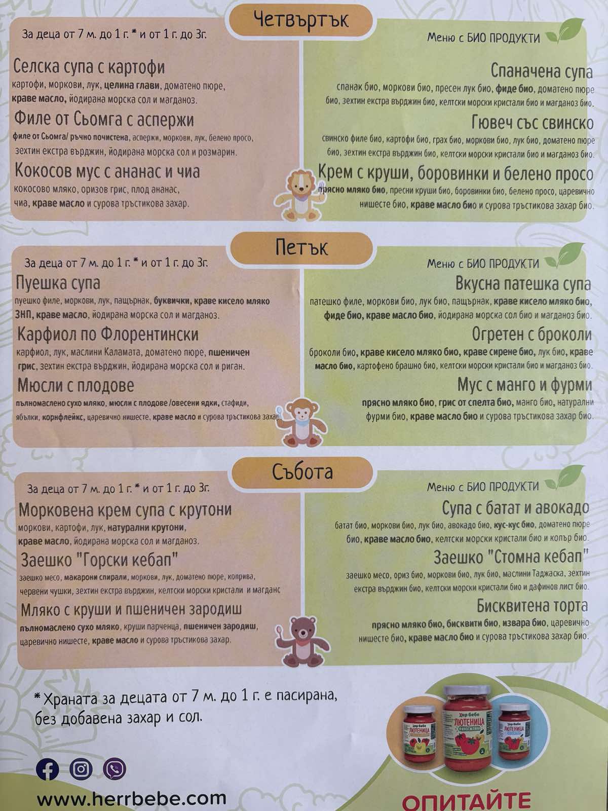 Менютата са съобразени изцяло с хранителния режим на децата Ви и техните калорийни нужди