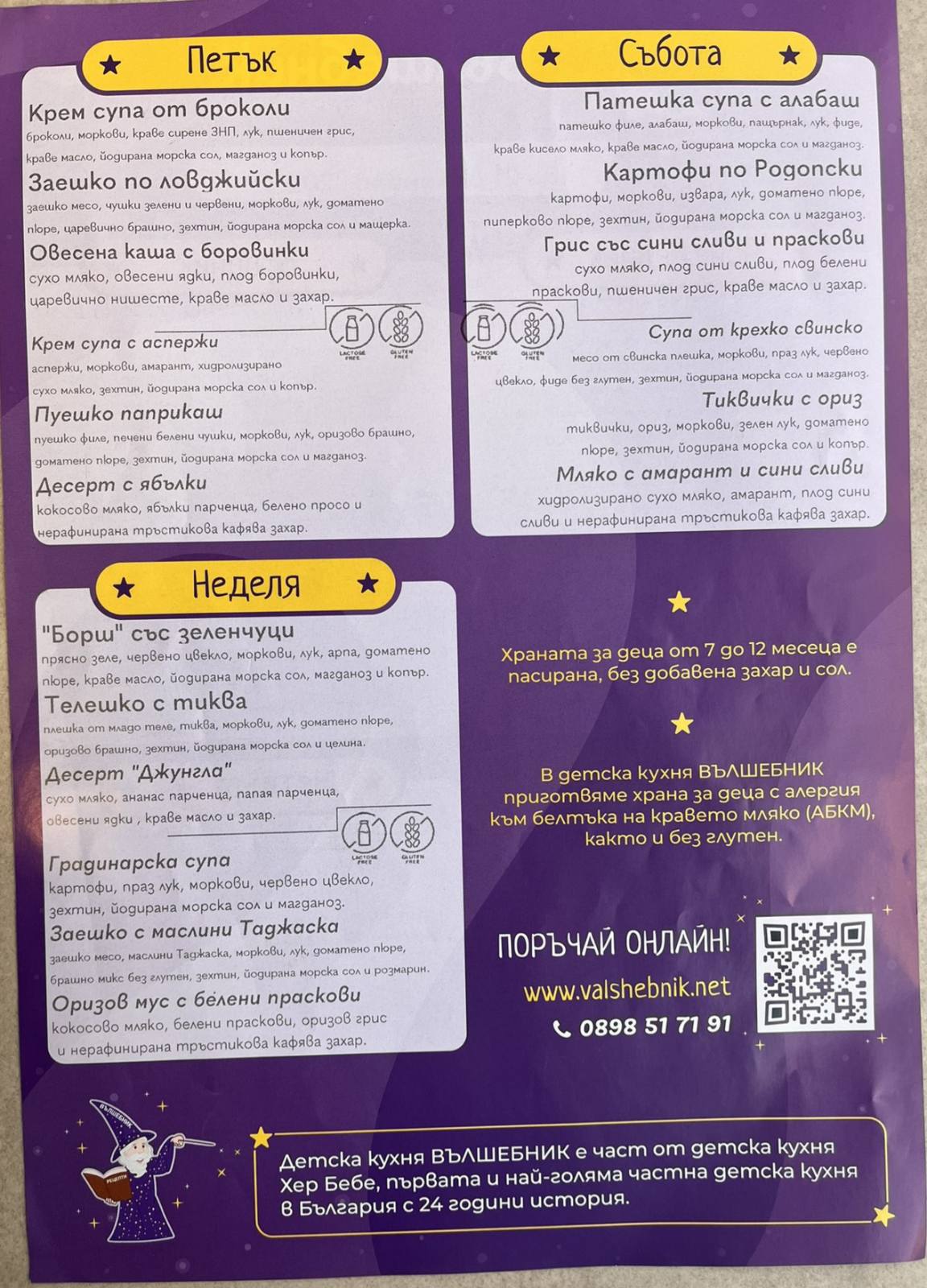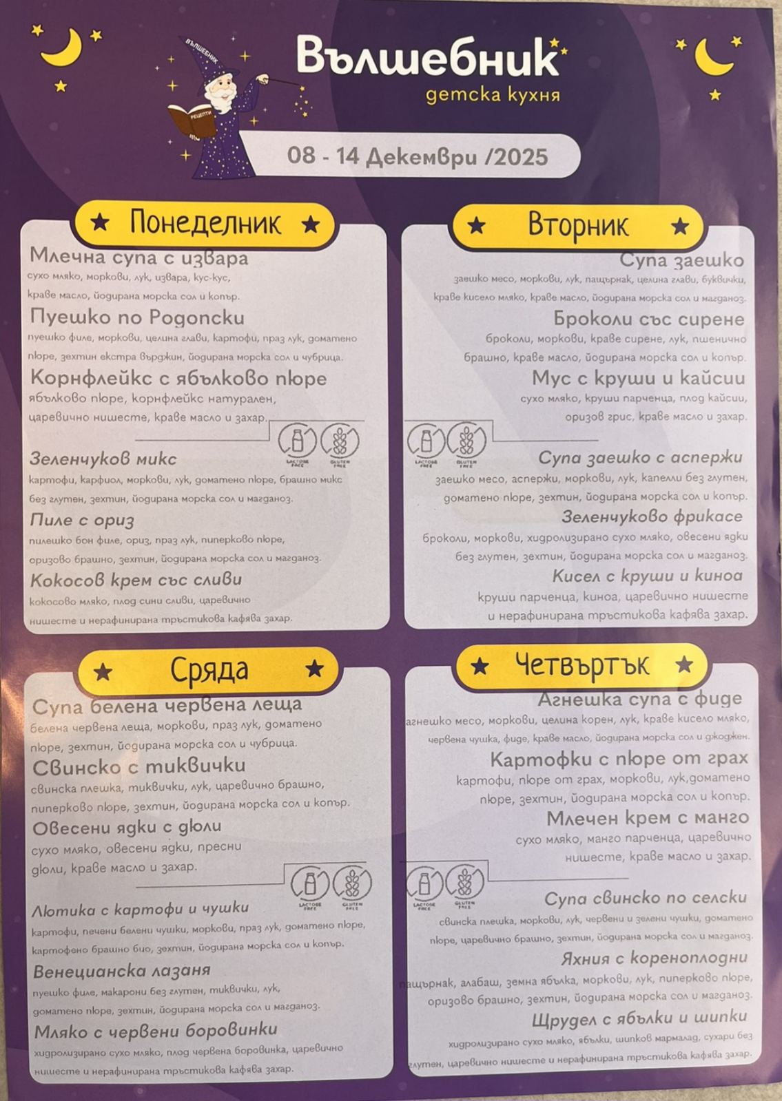 Менютата са съобразени изцяло с хранителния режим на децата Ви и техните калорийни нужди.