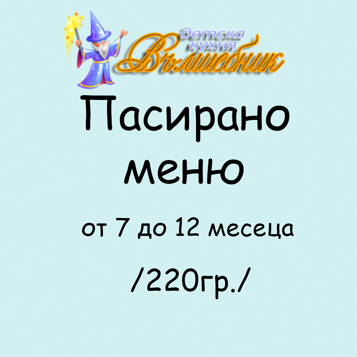 Менюто се състои от пасирани супа, основно и десерт - всяко по 220гр.