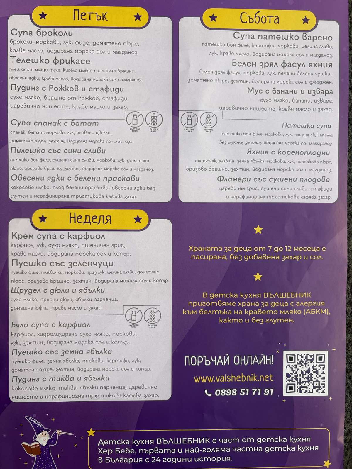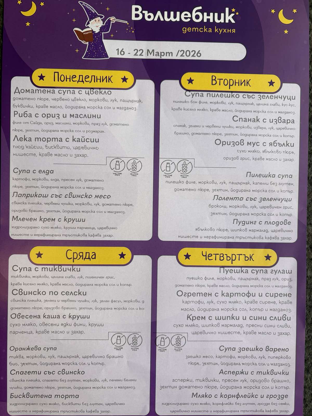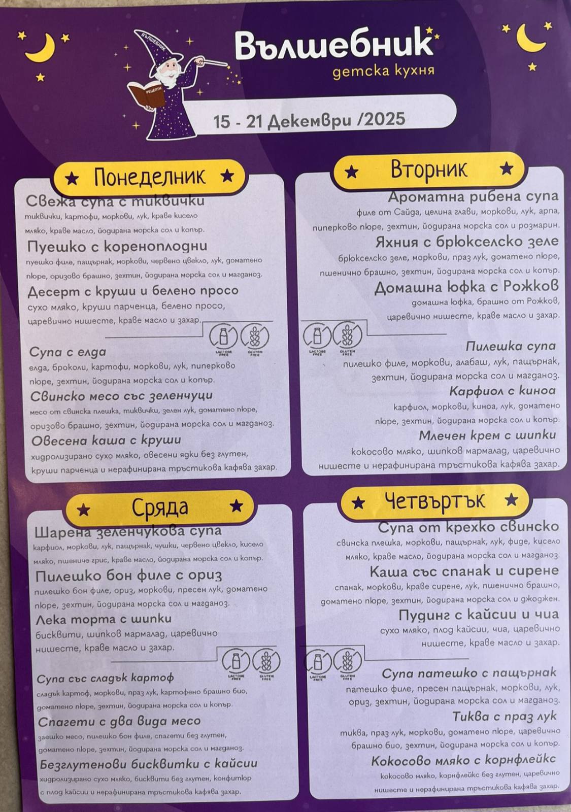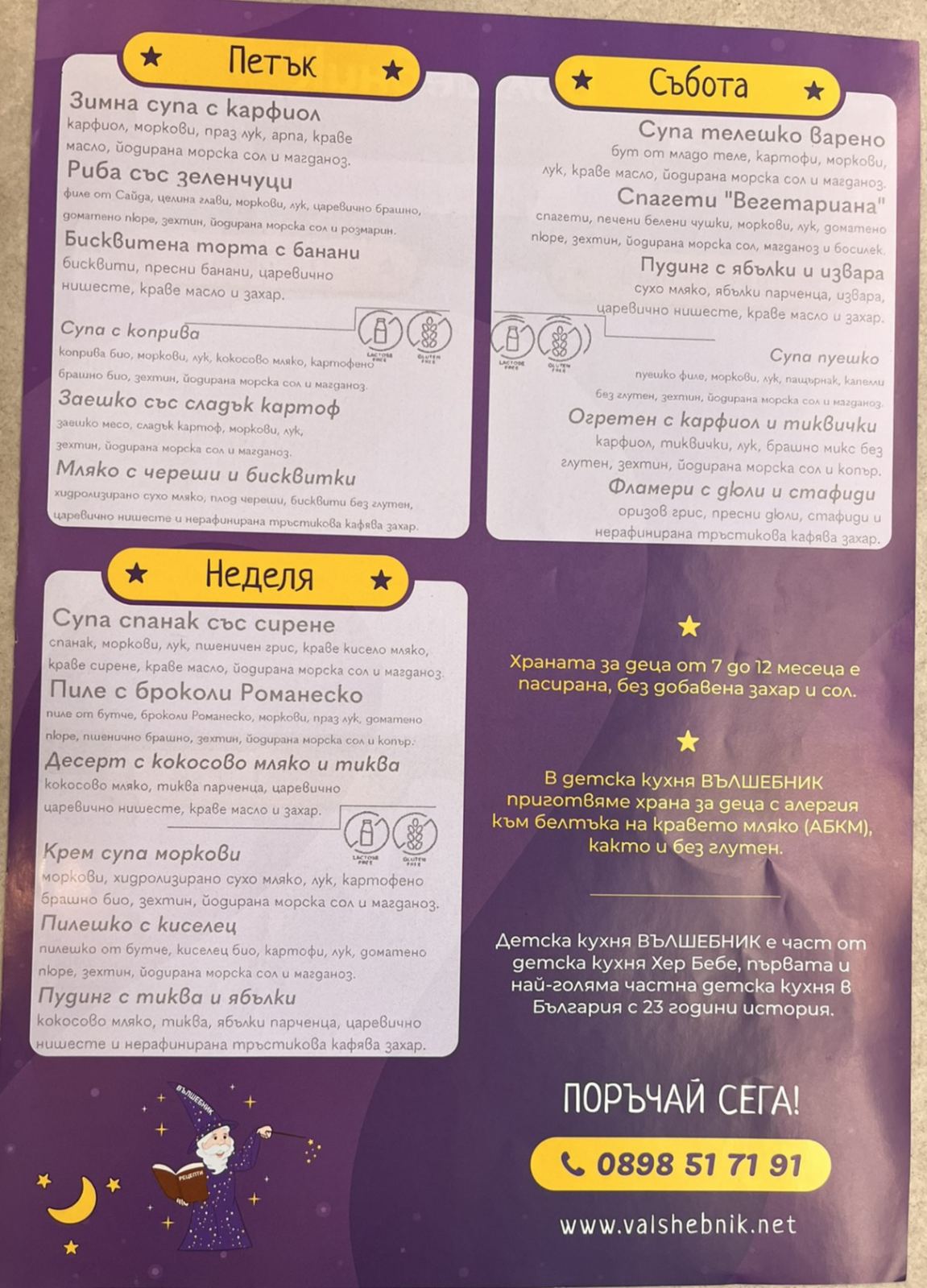 Менютата са съобразени изцяло с хранителния режим на децата Ви и техните калорийни нужди.