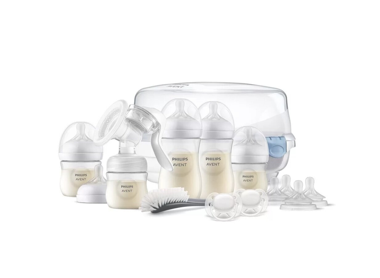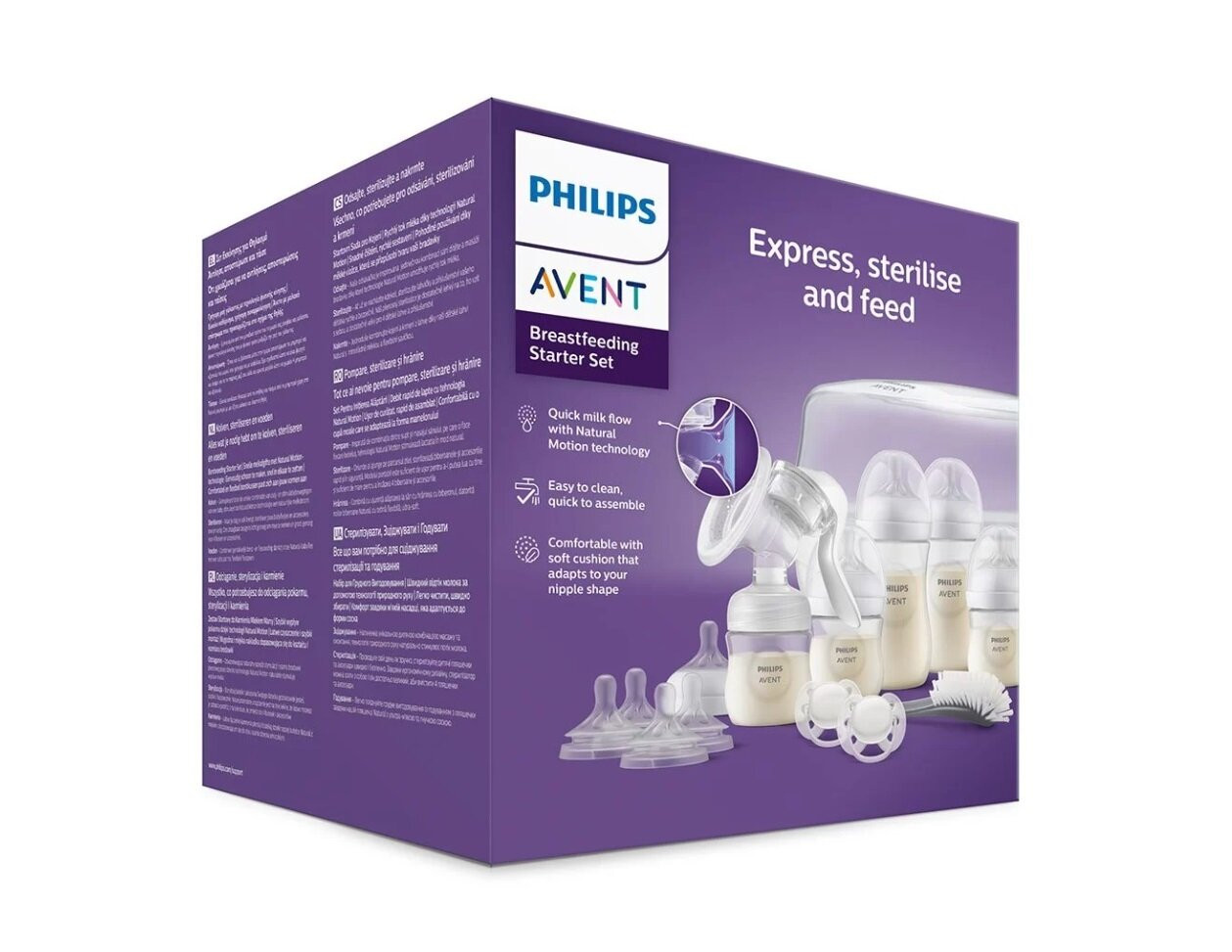 Съдържа всички продукти, необходими за стерилизиране, изцеждане на кърма и хранене на бебето от ден първи